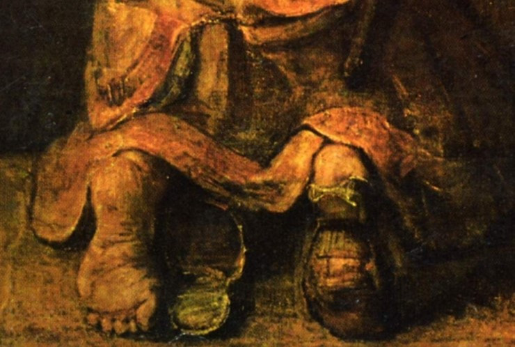 아들의 어깨 위에 얹힌 아버지의 두 손을 주목하면, 왼손은 투박하고 힘줄이 울퉁불퉁 솟은 노인의 것인데, 오른손은 가늘고 여린 여인의 것이다. 아들을 어루만지는 손은 무뚝뚝하지만 은근한 아버지의 사랑이 보인다. 한없이 따스한 어머니의 자애를 다른 한 손에 담았다. 아들의 발바닥과 신발을 보면 그가 얼마나 곤궁하고 비참한 인생을 살았는지 보여준다.