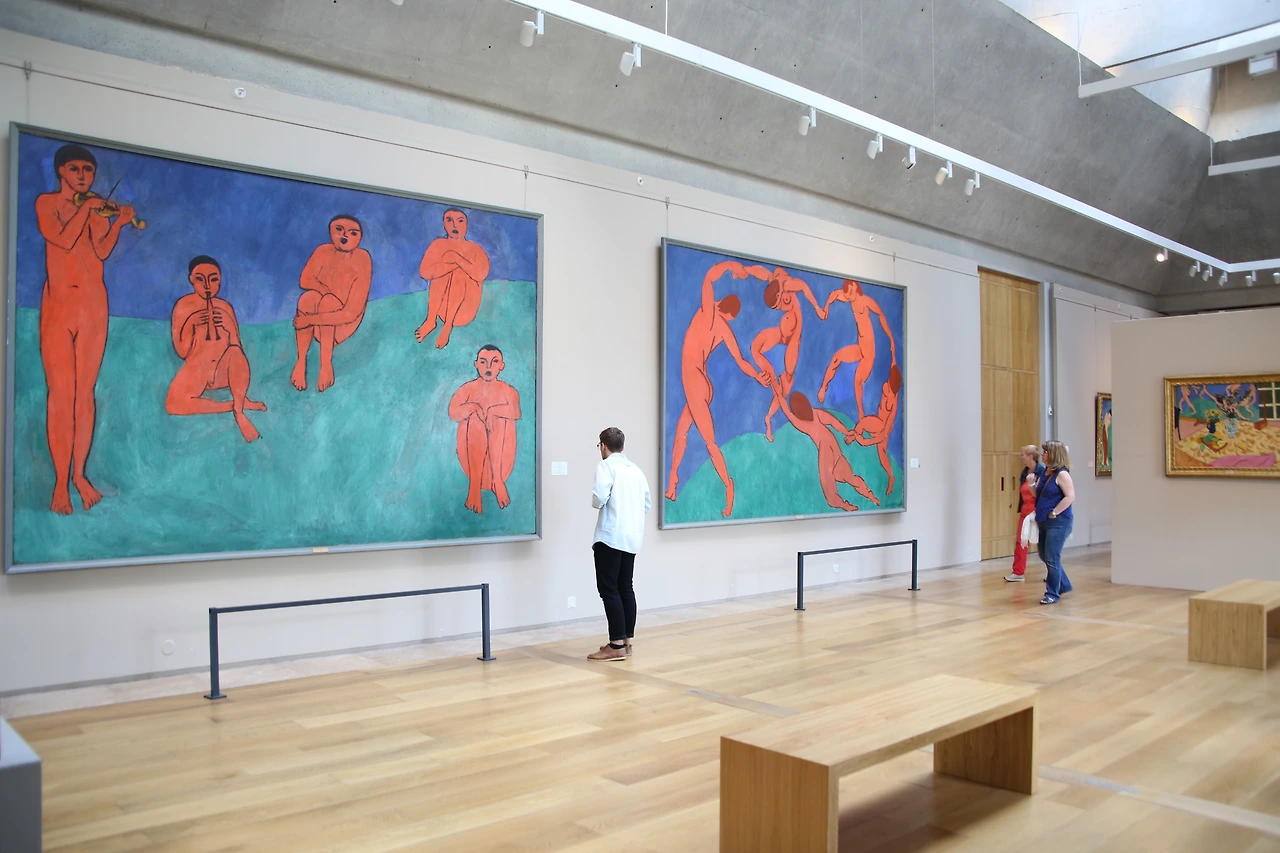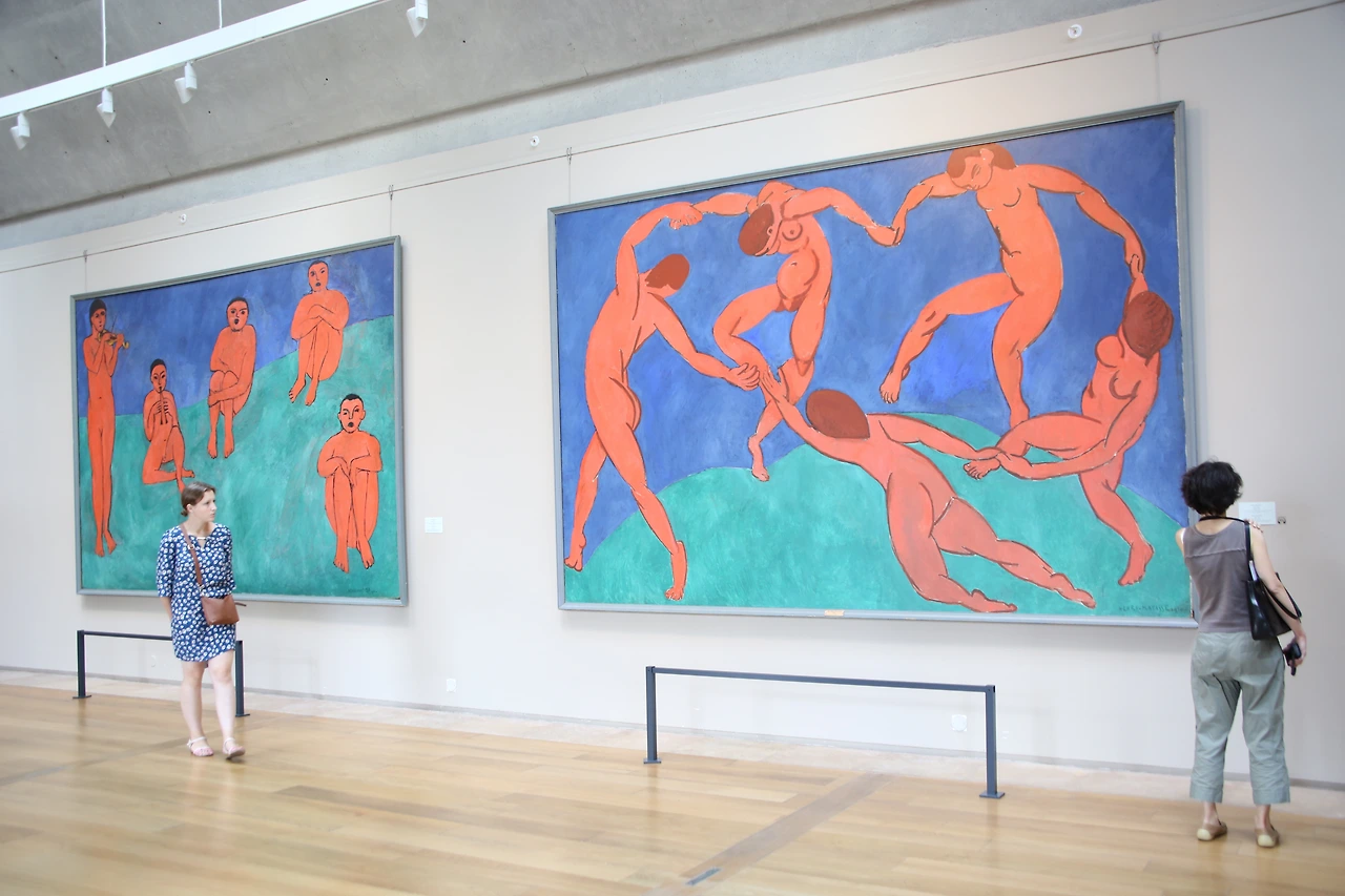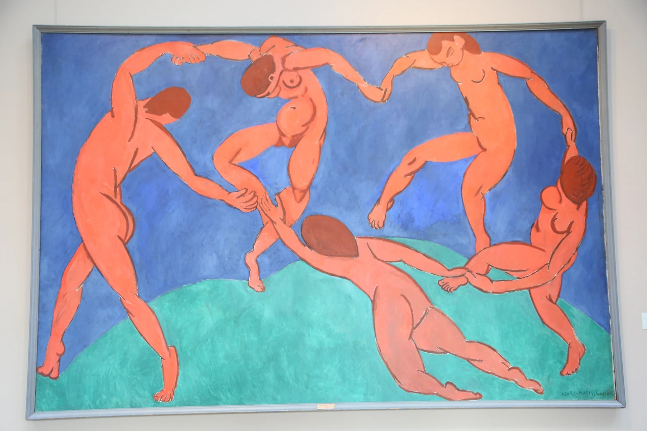 원근법을 무시한 상태에서 <춤>은 다섯 명의 여자들이, <음악은> 은 다섯 명의 남자가 나체로 악기를 연주하거나 노래하고 있다. 두 사람은 서서 악기를 연주하고 세 사람은 앉은 상태에서 평화롭게 노래한다. 이미 만들어진 음악이 아니라 우연히 마음이 맞은 즉흥 연주를 하는 느낌이다. <춤>은 마티스가 삶의 기쁨에서 모티프를 가져와 새로운 무게를 부여한 작품이다. 무희들은 손을 맞잡고 역동적인 원을 그린다. 더 빨리 춤출수록 발뒤꿈치가 높이 들린다. 오른쪽으로 기운 타원형은 시계방향의 움직임을 말해주며 춤의 불규칙한 에너지를 강조한다. 전면 왼쪽에 있는 두 댄서의 손은 완전히 맞닿지 않았다. 그 틈은 내가 닫아주어야 한다. 춤의 역동적인 리듬 때문에 인체가 뒤틀릴 지경이지만 그 때문에 표현력이 더해진다.
