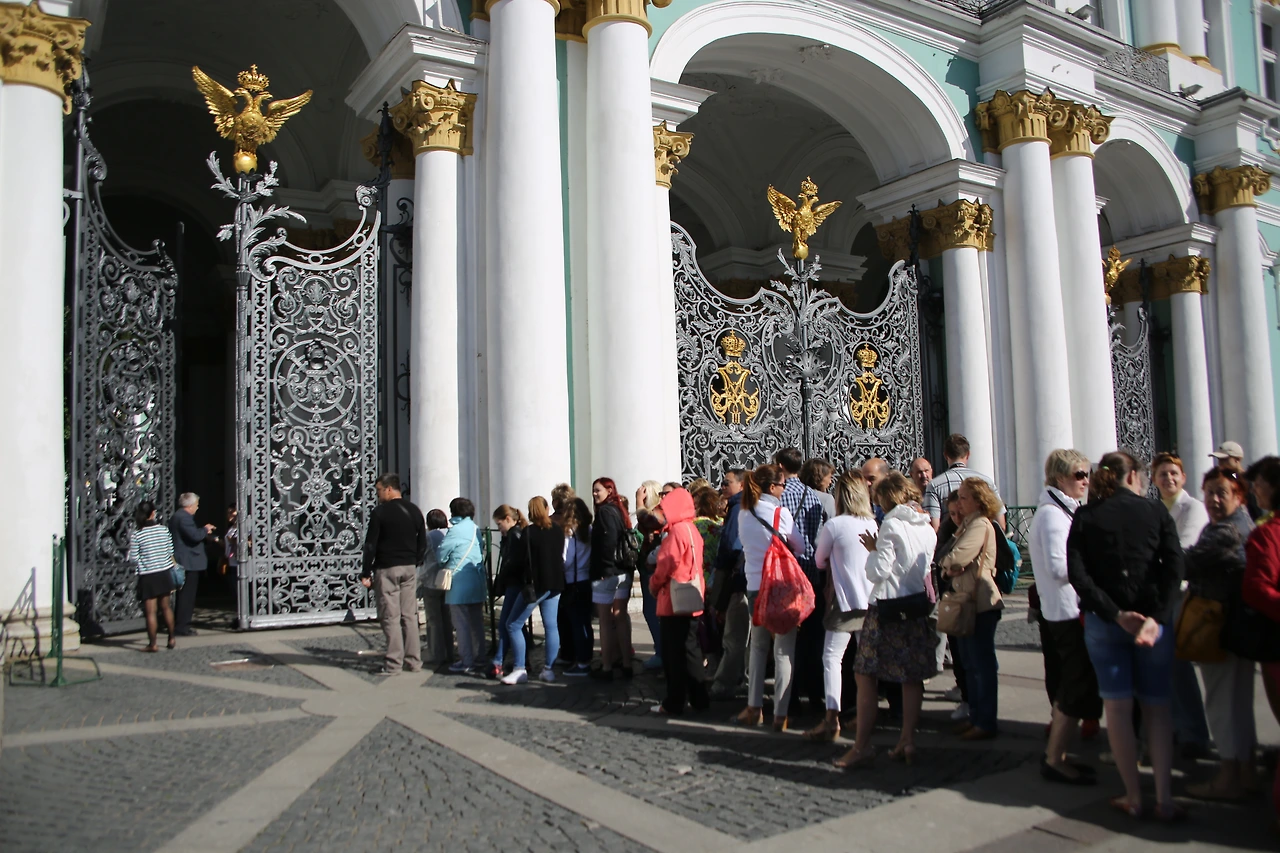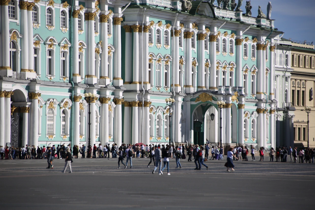 에르미타주는 담녹색 외관에 흰 기둥, 황금색 포인트 장식이 잘 어울리는 로코코 양식의 건물이다. 외관에서 풍기는 느낌이 우아하면서 지적이고 품위 있다. 축구장보다 더 커 보이는 광장엔 예상대로 우리보다 발 빠른 여행자들의 줄이 민트 색 본관 앞에 길게 늘어서 있었다. 입장 시간이 되려면 아직 한참을 기다려야 한다.