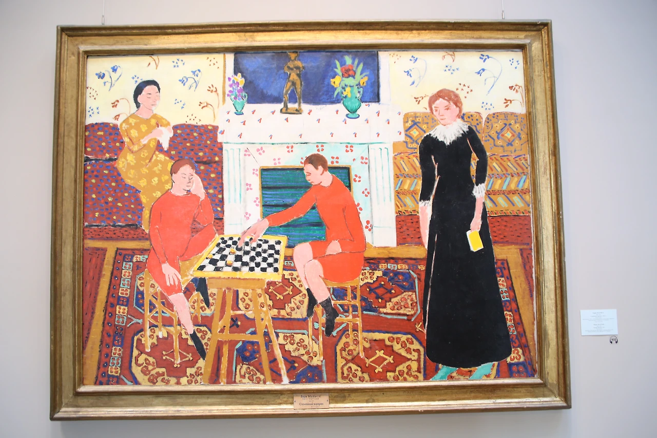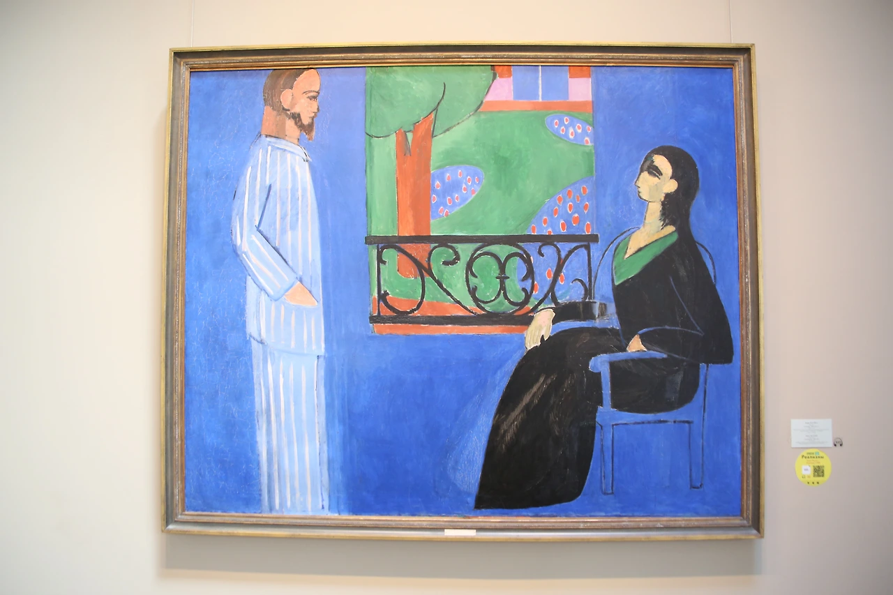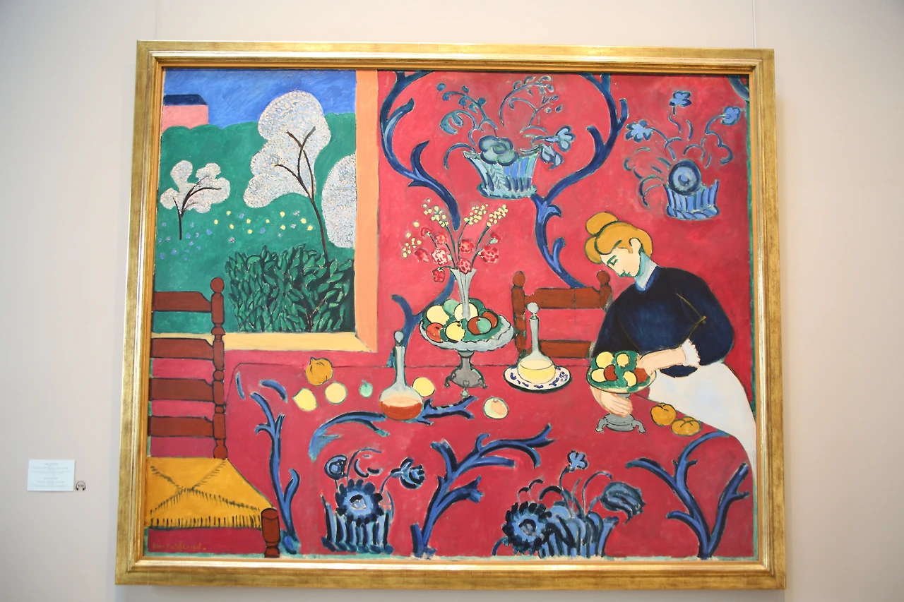 <음악>도 요소를 채택한다. 초록색 언덕과 푸른 하늘을 배경으로 다섯 개의 인체가 등장한다. <음악>에 나오는 남성 인체들은 <춤>의 타원형 모티프와 같은 동력으로 연결되어 있지 않다. 대신 그들은 고립되어 있고 음표처럼 한 줄로 배열되어 있다. 그 외에도 <화가의 가족들>, <붉은 방>, <푸른 식탁보>, <대화>등이 한 방에 걸려 있다. 행복한 향기가 나는 그 방에 한 동안 앉아 있었다.