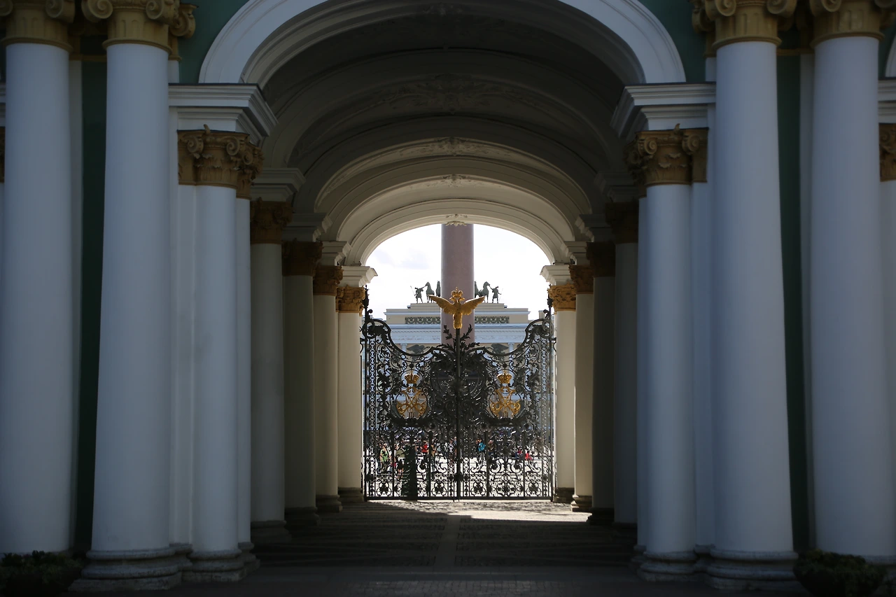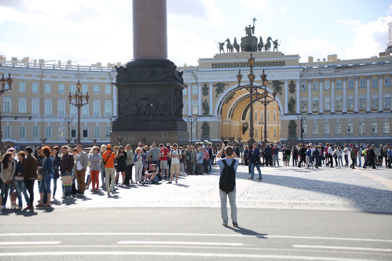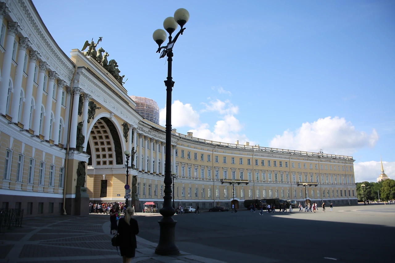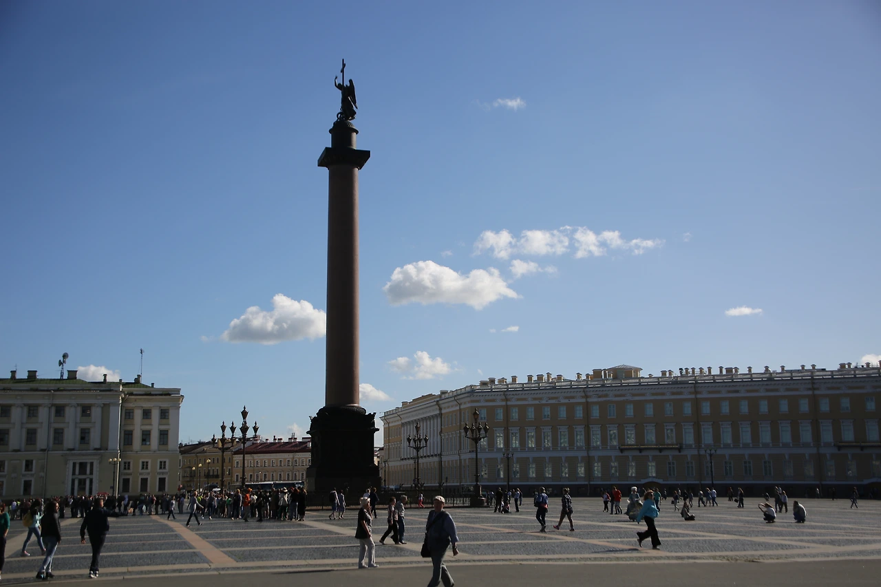 에르미타주 궁전 광장은 어마어마하게 넓다. 광장의 중앙에는 나폴레옹과의 전쟁에서 승리를 기념하여 세워진 알렉산더 원기둥이 높게 서 있다. 기둥의 꼭대기에는 한 장의 화강암으로 만든 십자가를 안은 천사상이 있다.