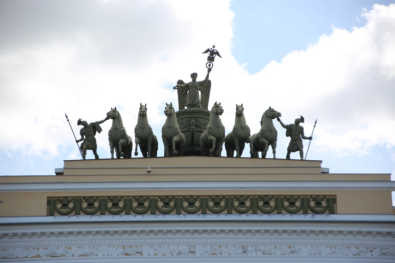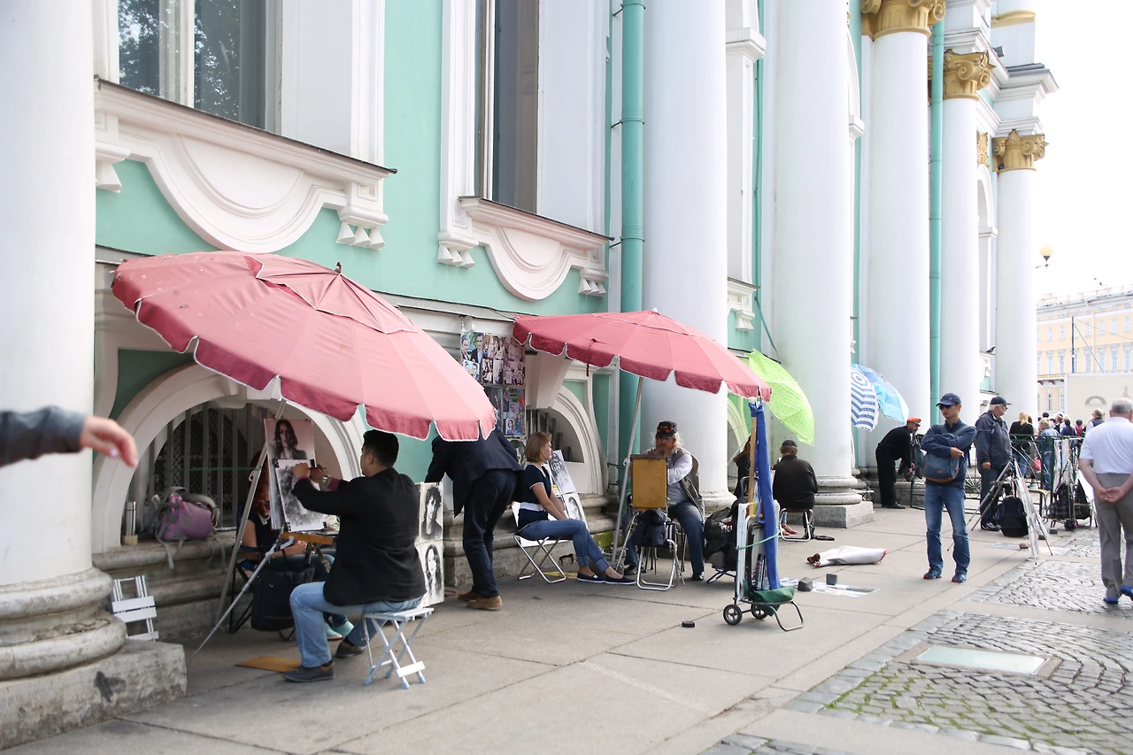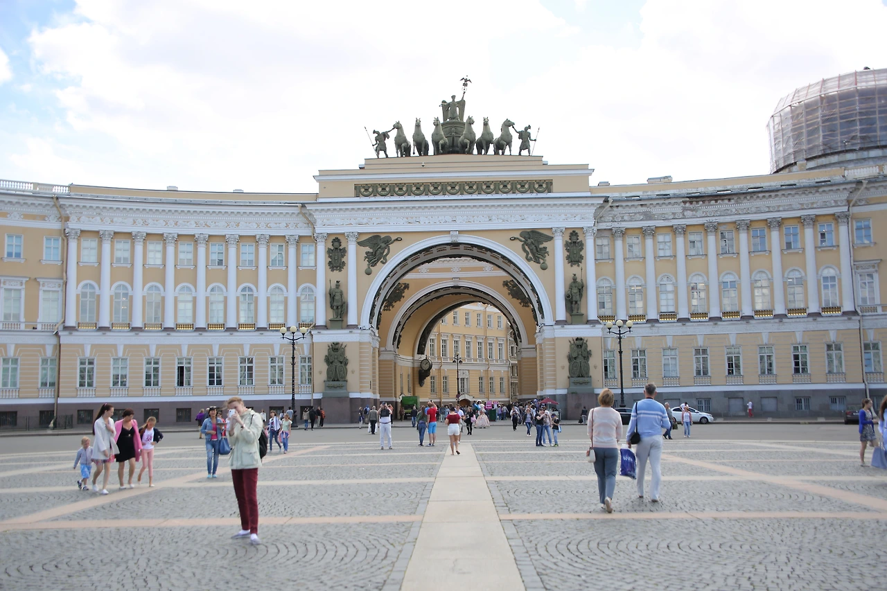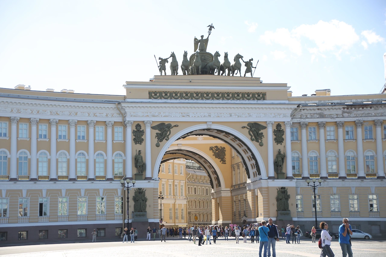에르미타주 궁전 광장은 어마어마하게 넓다. 광장의 중앙에는 나폴레옹과의 전쟁에서 승리를 기념하여 세워진 알렉산더 원기둥이 높게 서 있다. 기둥의 꼭대기에는 한 장의 화강암으로 만든 십자가를 안은 천사상이 있다.