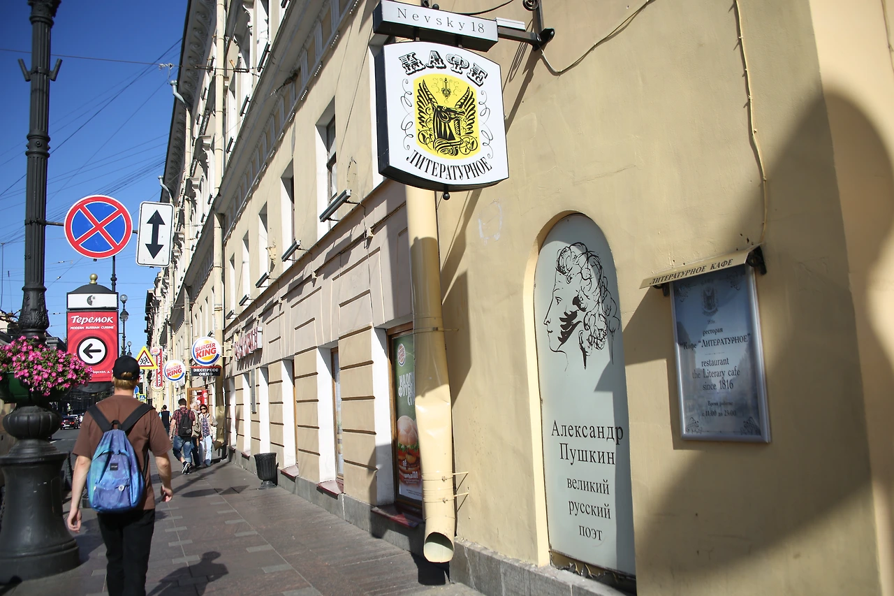 네프스키 대로를 걷다가 우연히 문학 카페(Literaturnoe)를 발견했다. 외관이 너무 허름하고 초라해 보여서 카페라고는 전혀 짐작되지 않을 정도였다. 운하가 보이는 카페 2층 창가 자리는 푸시킨의 단 골석이었다. 레모네이드를 마시고 결투를 하러 갔다가 다시는 그 카페로 돌아오지 못했다. 그 후 이 카페에서는 레모네이드를 팔지 않는다고 한다.