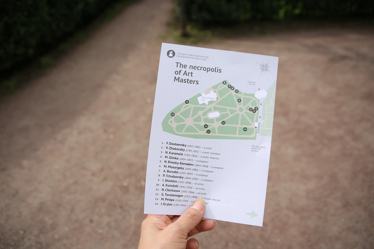 버스에서 내리니 작은 리어카에서 과일을 파는 아주머니가 있다. 알렉산드르 네프스키 수도원이 보였다. 골목엔 구걸을 하는 사람들이 엎드려있고 그들 곁을 지나는 게 영 맘이 불편했다. 작은 다리를 건너니 정면은 수도원으로 향하는 문이고, 양쪽으로 묘지로 들어가는 작은 문이 있다. 매표소에서 물어보니 예술가 묘역 티켓은 200 루블, 수도원은 200 루블, 나사로 묘지는 공짜란다. 티켓을 사고 예술인 묘역으로 들어갔다. 안내판에 무덤의 지도가 표시되어 있다. 내 손에는 영문으로 표기된 안내도가 들려있었지만 정작 묘비는 모두 키릴 문자라 구분이 쉽지 않았다. 마침 예술가 묘역에는 한 무리의 여행자들이 가이드의 설명을 듣고 있었다. 고맙게도 영어였다. 조금 미안하긴 하지만 그들 틈에 끼어 귀동냥을 하며 따라다녔다. 도스토옙스키, 글린카, 림스키 코르샤코프, 무소르그스키, 보로딘 등이 가까운 곳에 잠들어있다.