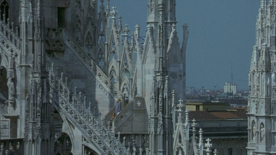 여자의 남편 탄크레디는 사위가 평탄한 지역의 대저택에 살고, 그 여자의 애인 안토니오는 좁고 굽은 길을 한참 거슬러 올라가야 하는 산 위 오두막에 산다. 딸 베타가 남자친구 그레고리오가 아닌 동료 여선생 앙가라드를 사랑한다는 편지를 우연히 읽은 엠마는 밀라노 두오모 계단을 거침없이 오른다. 칼날 같은 햇빛이 피뢰침 같은 첨두를 때리고 있다. 성당 벽면은 마리아와 예수, 성인들의 성화로 가득하다. 그녀는 빨려 들어가듯 성큼성큼 두오모에 오른다. 레이스 같이 조각해 놓은 두오모의 첨탑이 도열하듯 그녀를 맞이한다. 날카롭고 신경질적으로 보이는 성당의 첨탑은 주인공의 화를 한층 끌어올리는데 안성맞춤이다. 그곳은 겉과 속이 다른 도시의 불신과도 같다. 옹색한 내면을 감추기 위해 겉을 화려하게 치장하는 재벌가의 불안과도 닮아있다. 그녀에게 두오모는 도시의 처음과 끝이었다. 밀라노에서 가장 높은 그곳에서 그녀는 감옥에 갇힌 듯 옴짝달싹 못하는 자기 자신을 만난다. 편지를 손에 쥔 채 더 높은 첨탑을 올려다보는 장면에 이어진 씬은 산레모의 산속 안토니오의 집이다. 자유롭게 사는 사람은 무너질 삶이 없다. 반대로 완고하고 도덕적인 사람이 무너지면 치명적이다. 돌이킬 방도가 없는 것이다.