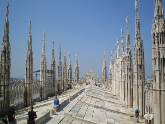 밀라노의 두오모 꼭대기는 계단으로 걸어서 올라가면 8유로, 엘리베이터를 타려면 12유로. 공짜라면 혹시 모르지만 돈 내고 굳이… 하며 엘리베이터를 택했다. 3-4명이 겨우 탈 수 있는 소형 엘리베이터로 옥상 테라스까지 올라갔다. 어떠냐고? 결론은 ‘밀라노의 두오모 지붕에 올라가지 않고서 두오모를 봤다고 하지 마라’. 정면에서는 결코 보이지 않는 첨탑이 높이와 모양을 달리 하고 서있다. 그 끄트머리엔 저마다 다른 성인들의 조각이 세워져 있다. 돌조각이 레이스처럼 치밀하게 아름답다. 루카 구아다그니노 감독에게 고맙다. 그가 영화 <아이 엠 러브>를 만들지 않았더라면 나는 그곳에 올라가지 않았을 테니까.