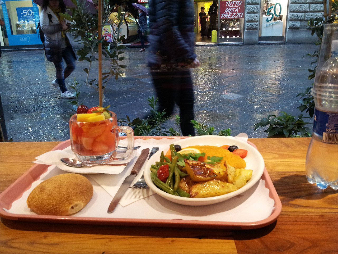 짐을 부려놓고 지도를 얻어 들고 밖으로 나왔다. 사흘 동안 좁은 골목을 걷고 수로로 배를 타고 이동했던 것에 벌써 익숙해진 것일까? 대처에 처음 온 시골뜨기처럼 대도시의 빌딩과 속도가 마뜩했다. 남자들만 예쁜 여자 쳐다보는 게 아니다. 세계적인 패션 도시니 만큼 말쑥하게 코트와 장장을 차려입은 이태리 신사들을 구경하느라 눈이 휘둥그레졌다. 점심을 먹으러 들어간 식당은 셀프서비스였다. 식판에 포크와 나이프를 챙겨 든 다음, 빵이나 음료, 샐러드, 피자, 생선 요리, 과일, 젤라토 등 자신이 원하는 것을 담은 후 마지막에 계산을 하고 먹으면 되었다. 시내 중심가였지만 값싸고 빨리 먹을 수 있다는 장점 때문인지 많은 사람들이 줄지어 있었다. 그런 음식점은 여행자들에게도 제격이다. 빵과 콜라, 피자와 그릴에 구운 생선, 샐러드와 모둠 과일로 모처럼 만찬 같은 식사를 했지만 값은 20유로 남짓했다.