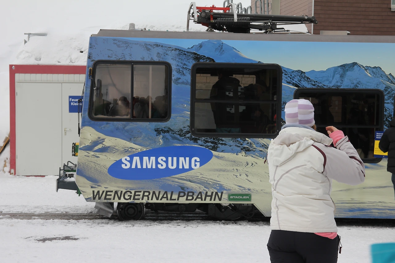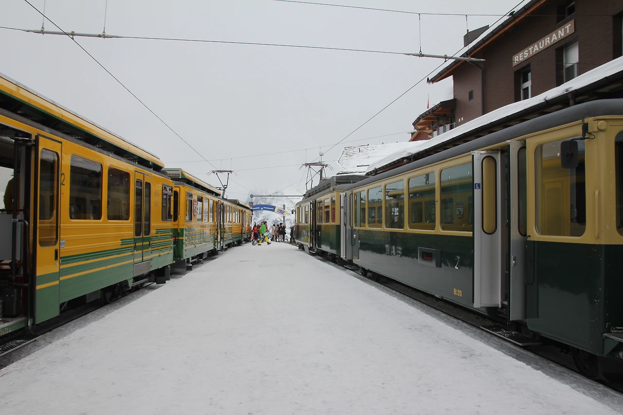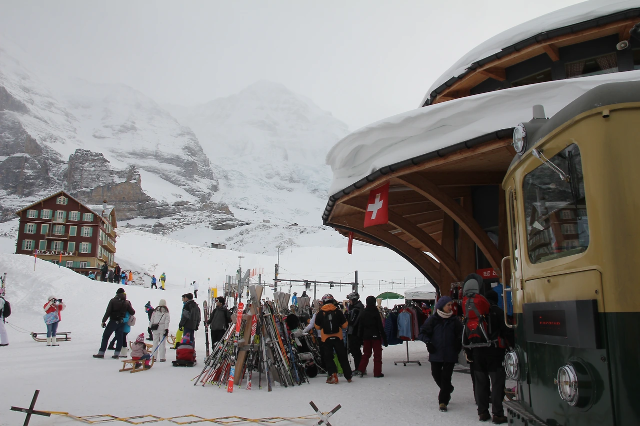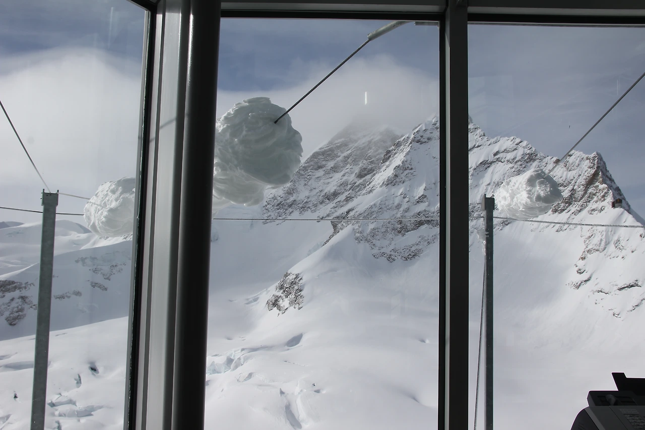 다음 날, 눈이 내려있었다. 눈을 쏟아낸 하늘과 호수의 빛이 어우러진 공기가 온통 푸르스름하다. 어차피 공짜로 탈 수 있는 유레일패스가 있으니 기차를 타기로 했다. 인터라켄 웨스트 역에서 오스트까지 10분쯤 걸린 듯했다. 우리는 라우터브루넨- 클라이네 샤이 텍-융프라우-크라이네 샤이 텍-그 린덴 발트 코스의 티켓을 구입했다. 한 여름의 융프라우는 끝없는 초원과 양 떼, 종 모양의 방울을 달고 있는 소, 들꽃, 하이킹하는 사람들과 서있는 집들이 아름다웠었다. 그러나 1월의 융프라우는 온통 하얀 설원에 울긋불긋한 스키어들의 옷과 눈부신 햇살이 눈을 뜨기 어렵게 만들고 있었다. 융프라우까지 가는 사람들보다 중간중간 내리는 스키어들이 열차를 빼곡하게 메웠다. 걸음마를 겨우 시작했을 밥한 아기 스키어부터 호호 할머니까지 다양한 컬러의 옷을 입은 스키어들이 시키와 폴대를 들고 스키 부츠를 신고 무거운 발걸음을 옮겨 다니고 있었다. 우리가 꼬마열차를 타고 융프라우 정상에 도착했을 때, 바람 한 점 없고 따뜻했다. 전에 융프라우에 올랐을 때에는 한 여름임에도 불구하고 가죽점퍼를 챙겨 입었어도 추웠던 곳이다. 우리는 오리털 파카에 목도리와 털실로 짠 빵모자, 장갑까지 중무장을 하고 올라갔다. 그런데 그날 그 시각, 해발 3400미터의 고산은 믿기지 않을 정도로 따뜻하고 온화했다. 무료로 받은 컵 라면 쿠폰으로 신 라면을 먹었다. 고산증세를 느꼈는지 친구 M이 메스껍고 약간의 어지럼증을 느낀다고 했다.