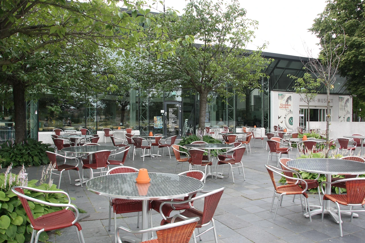 아주 단순한 외관의 미술관 앞에 노천카페의 테이블과 의자들이 놓여있습니다.