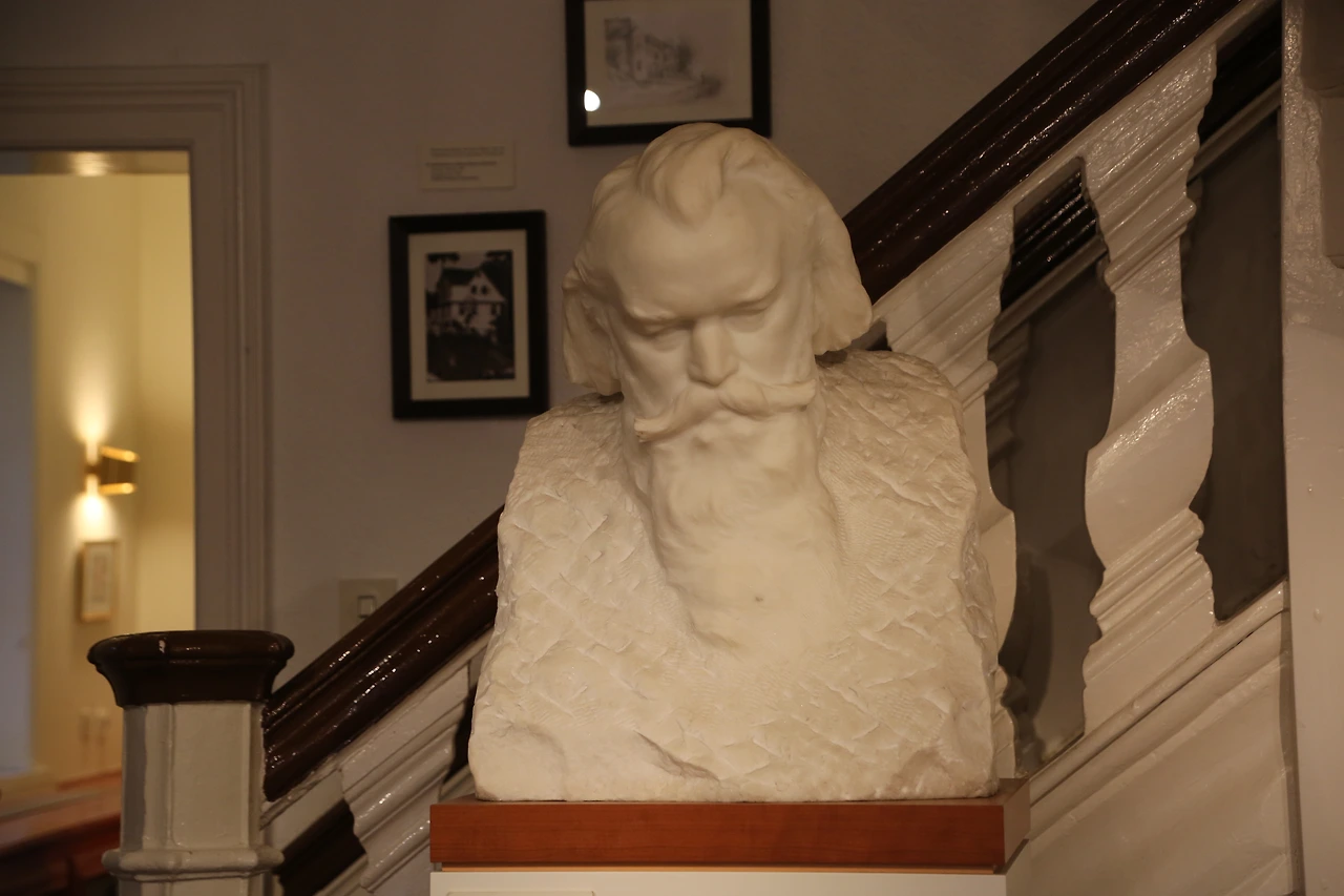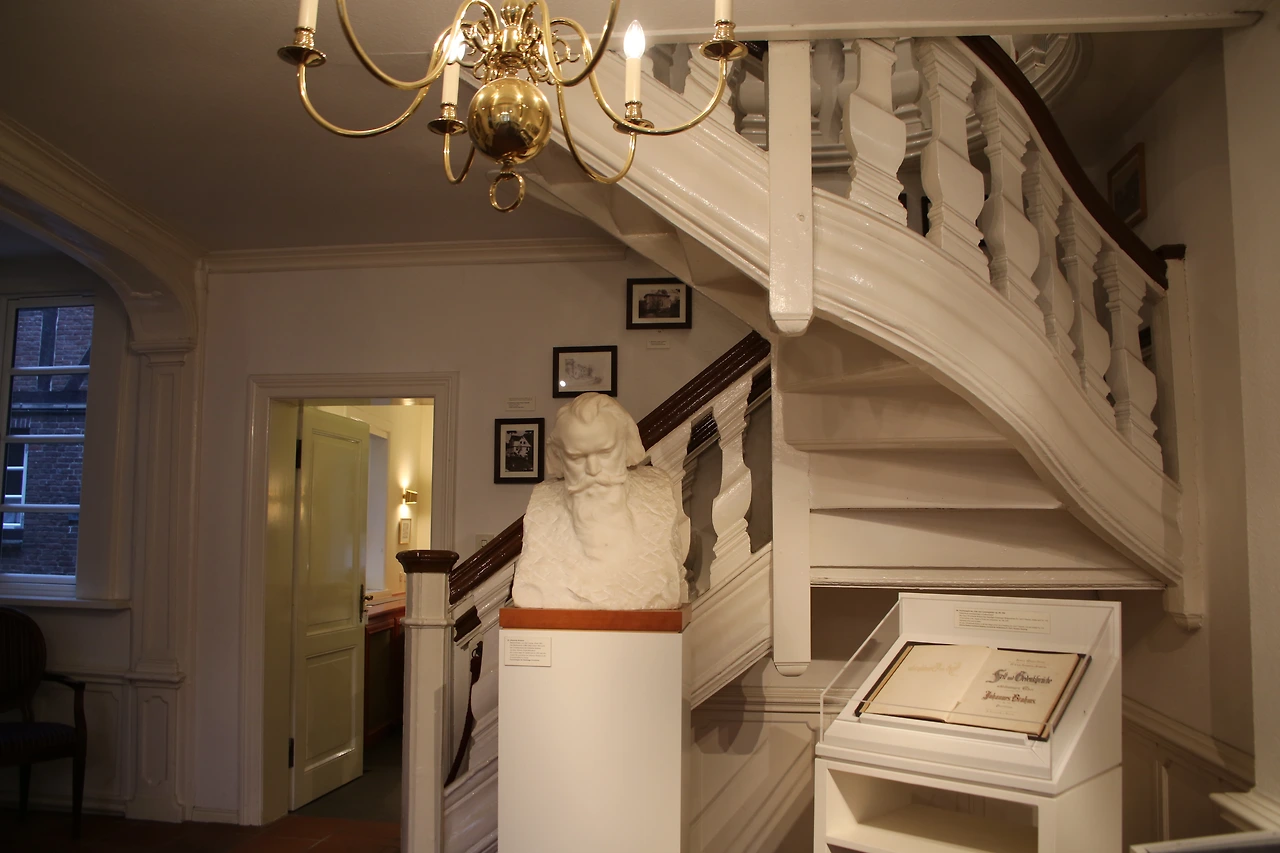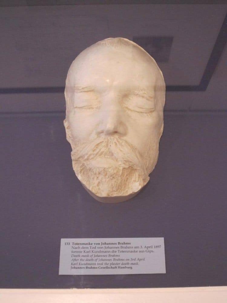 브람스의 흉상, 사진, 그리고 데드 마스크가 있습니다.