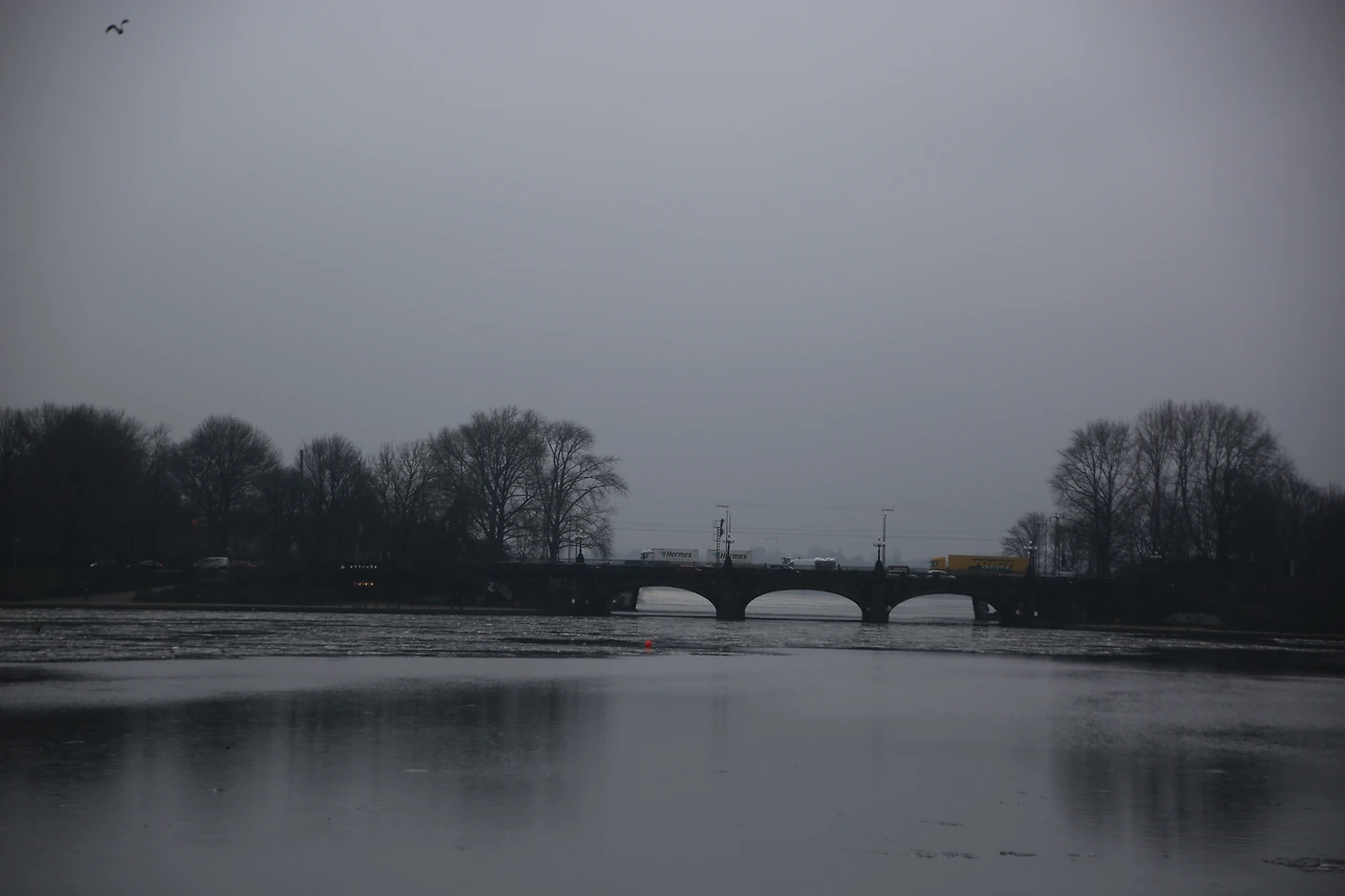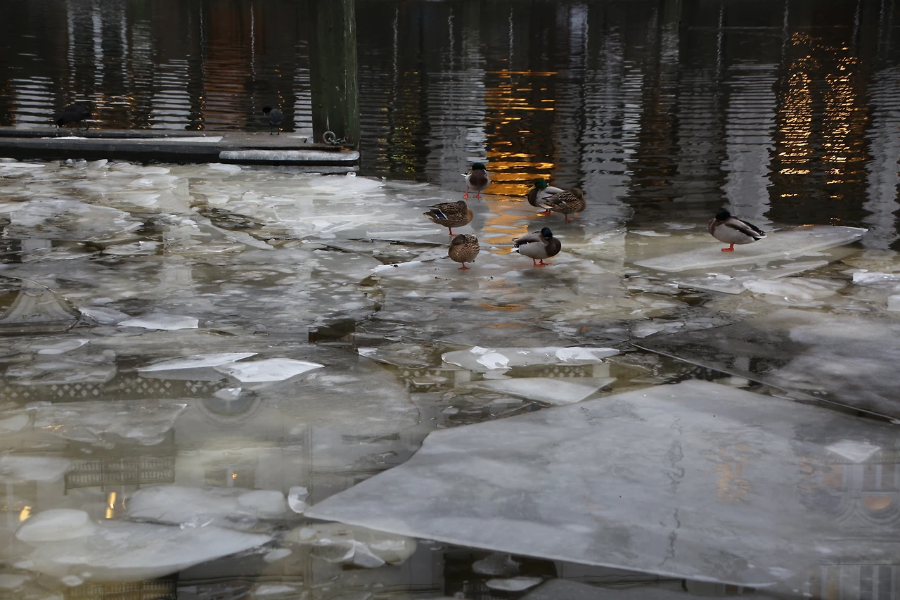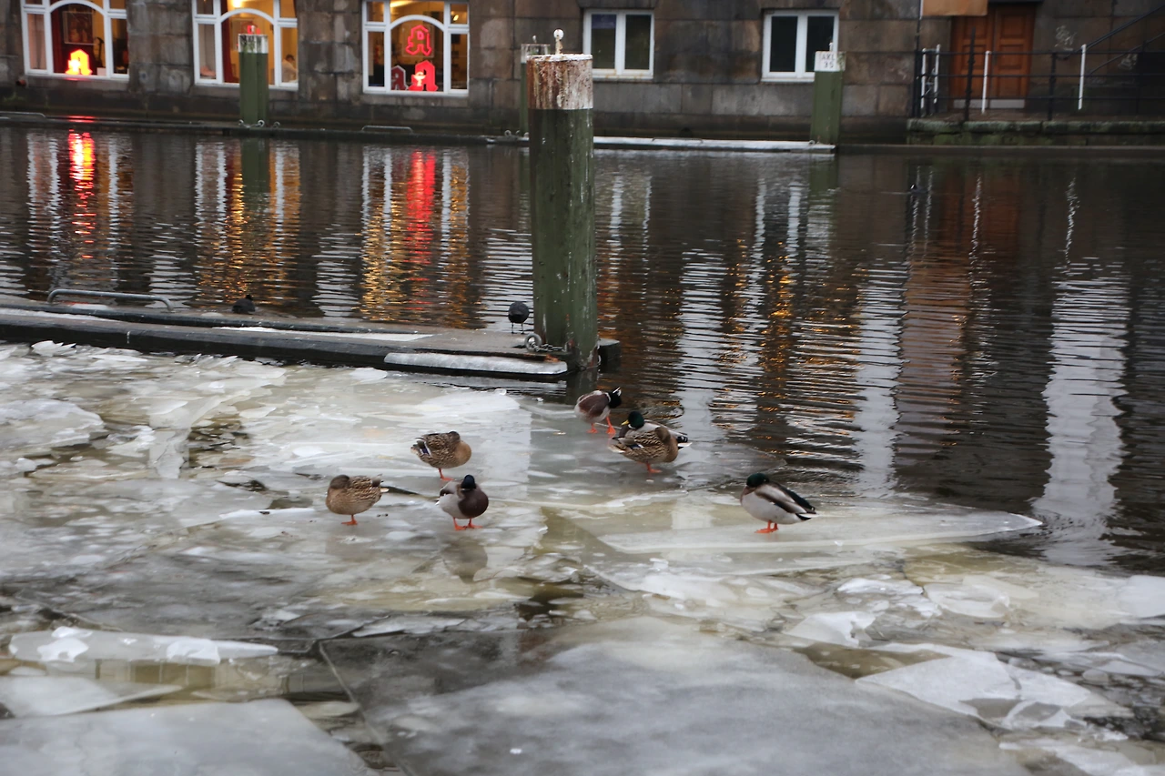 인공으로 만들어진 알스터 호수의 얼음 위에 오리들이 있어요.