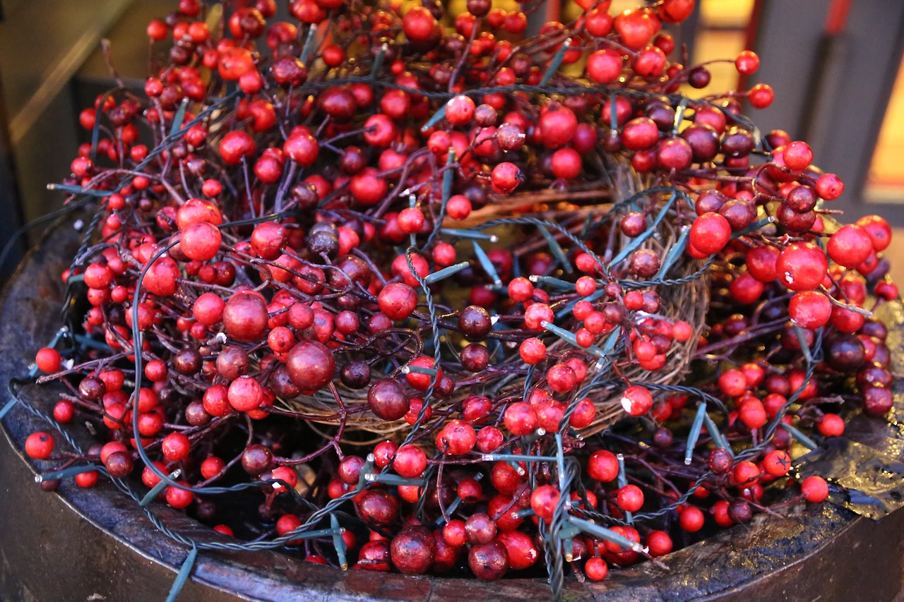 호텔 현관 앞의 낡은 오크 통 위에 빨간 열매가 소담스럽네요.