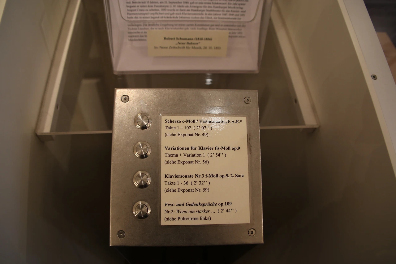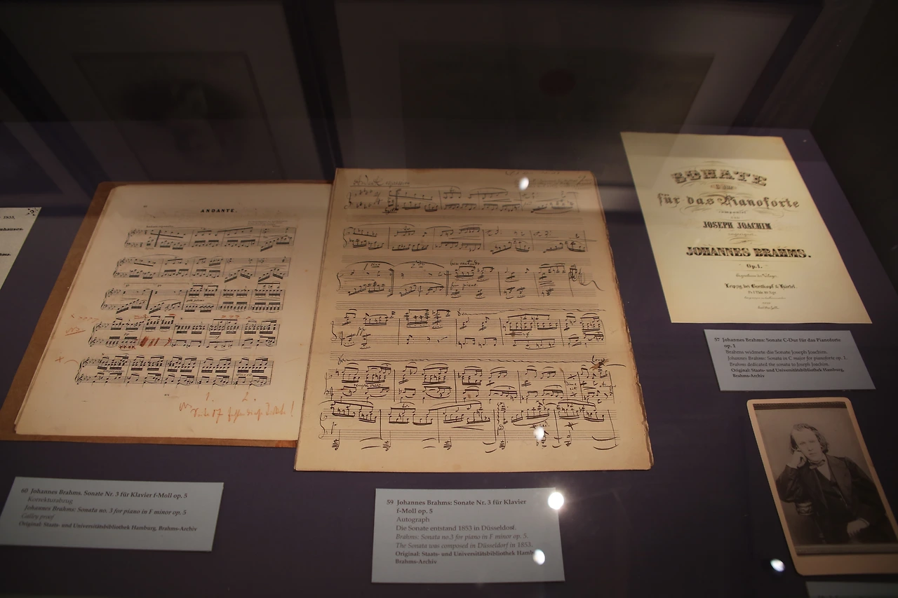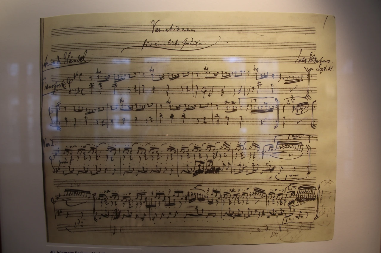 브람스와 슈만의 자필 악보들이 유리 상자 속에 들어있어요.