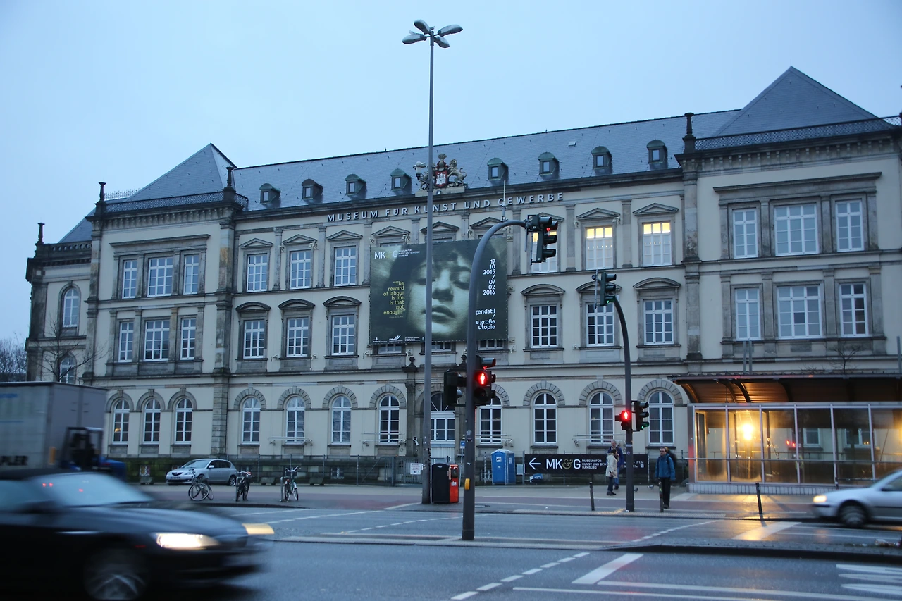침침한 색의 오래된 건물에 MUSEUM FUR KUNST UND DEWERBE라고 쓰여있어요.
