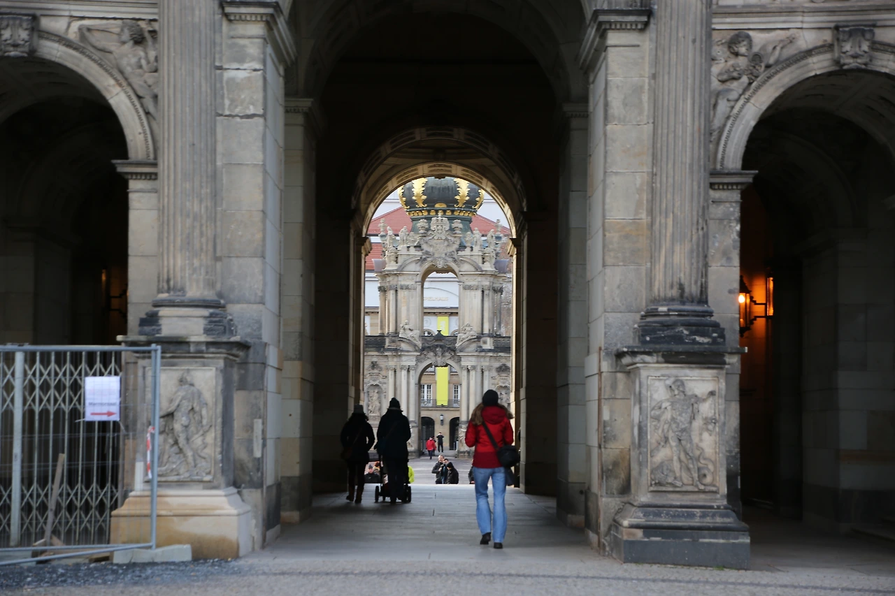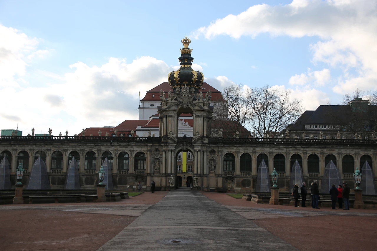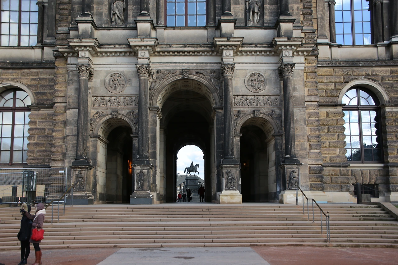 츠빙거에서 가장 인상적인 것은 왕관의 문과 아치 문을 통해 보이는 작센 왕의 기마상이었어요.