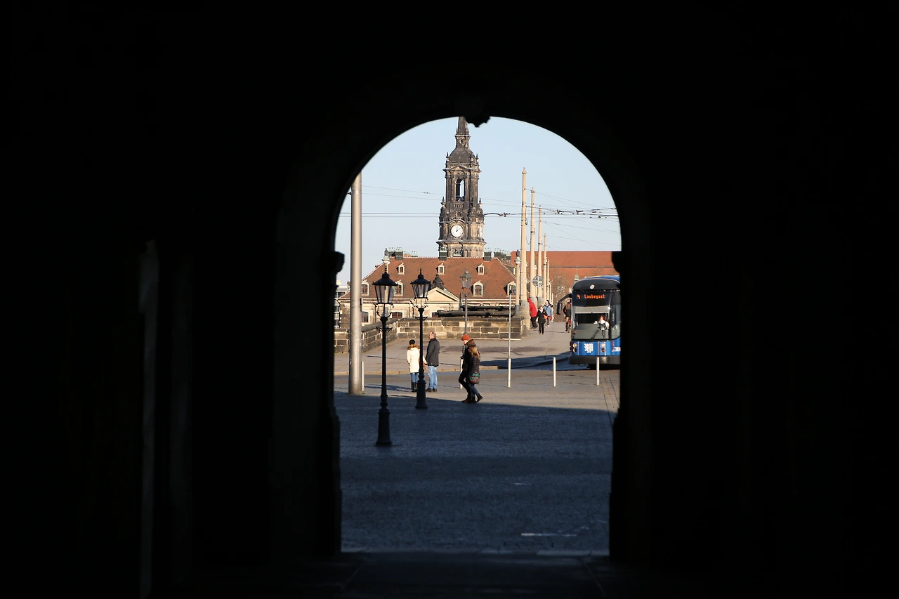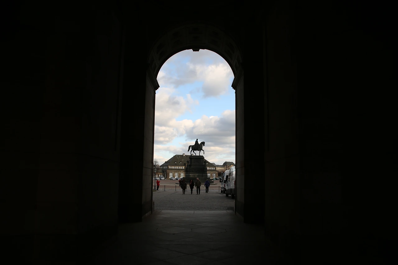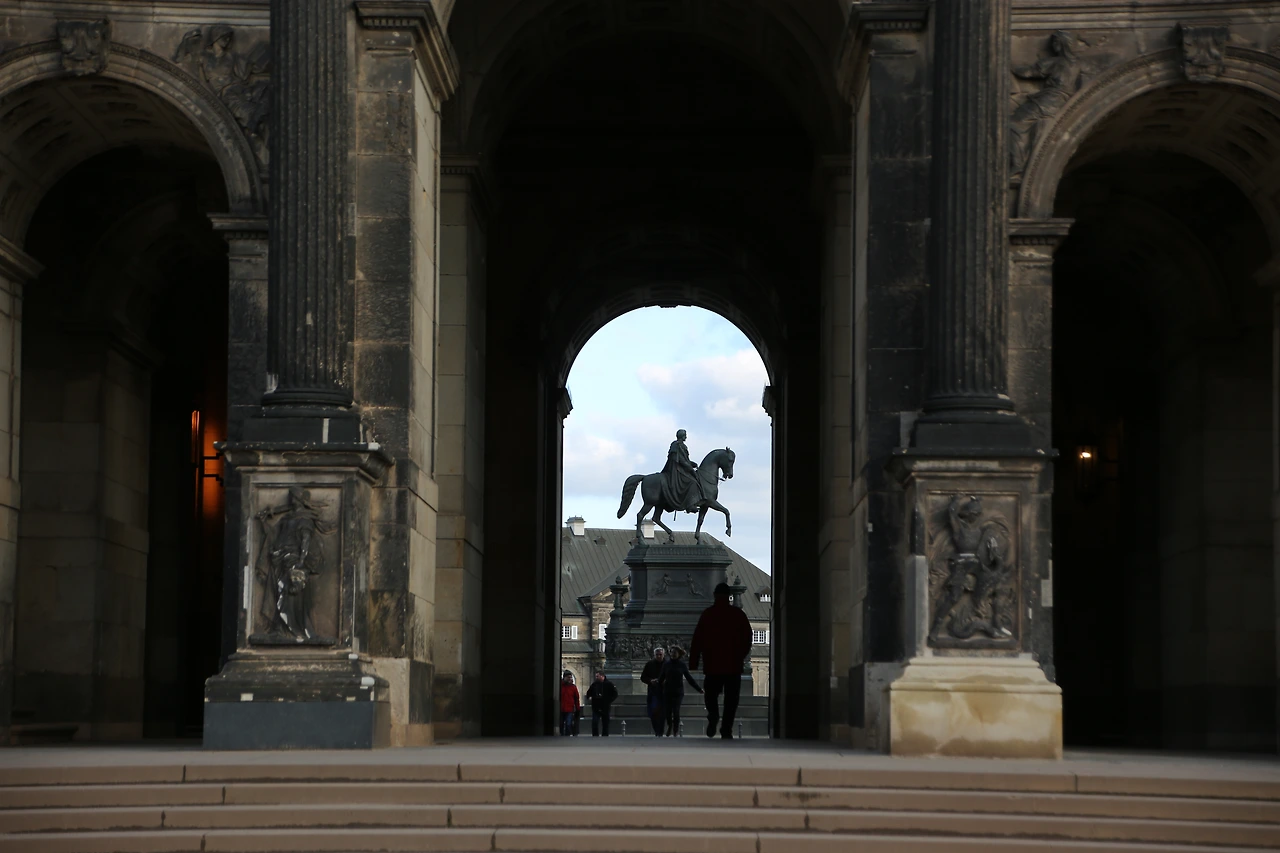 츠빙거에서 가장 인상적인 것은 왕관의 문과 아치 문을 통해 보이는 작센 왕의 기마상이었어요.