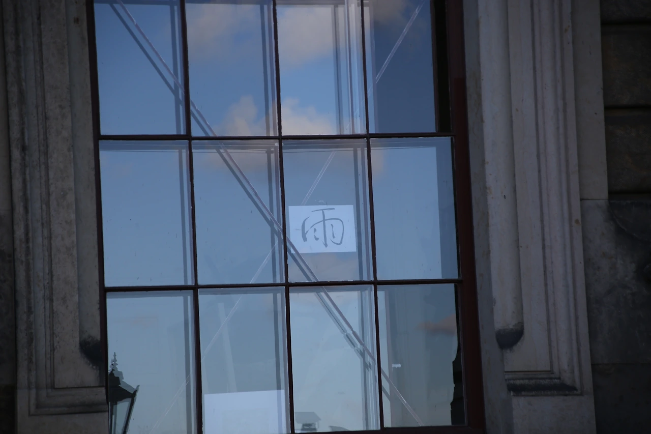 유리창에 들어있는 파란 하늘과 하얀 구름,