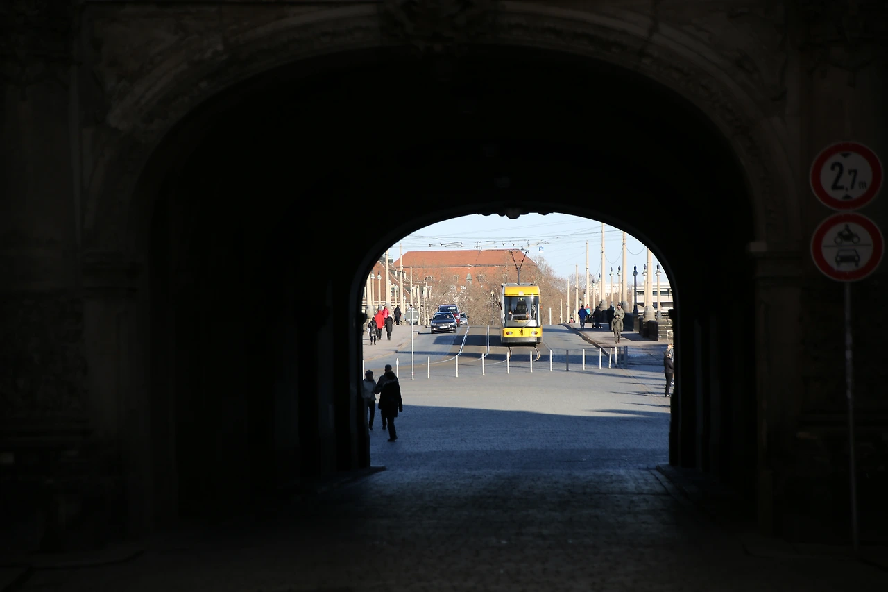 아치 모양의 통로 너머로 노란색 트램이 지나가는 게 보여요.