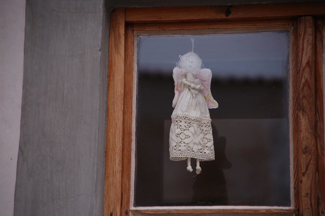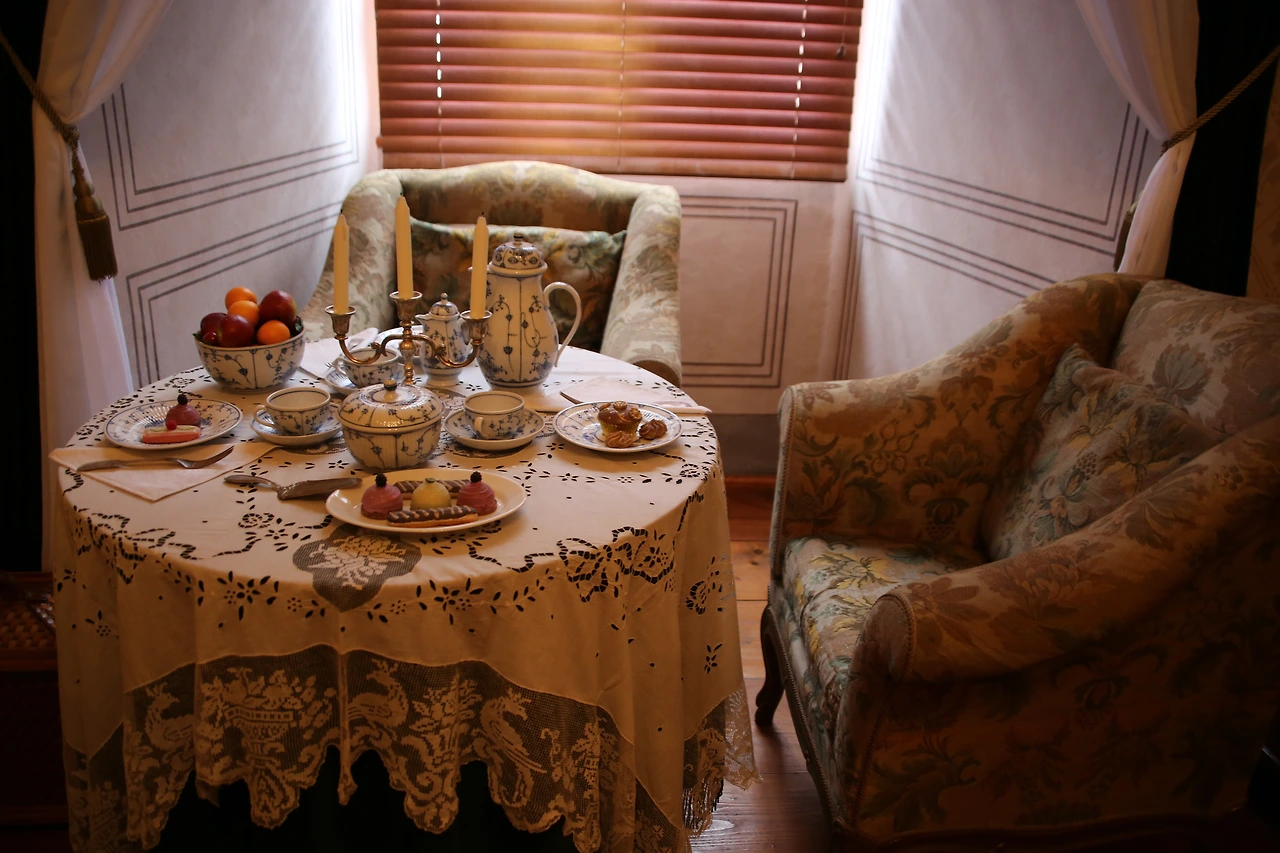 색이 바래긴 했지만 정갈한 레이스 테이블보가 덮인 원탁엔 푸른 장식이 그려진 도자기 주전자와 찻잔이 놓여있어요.
