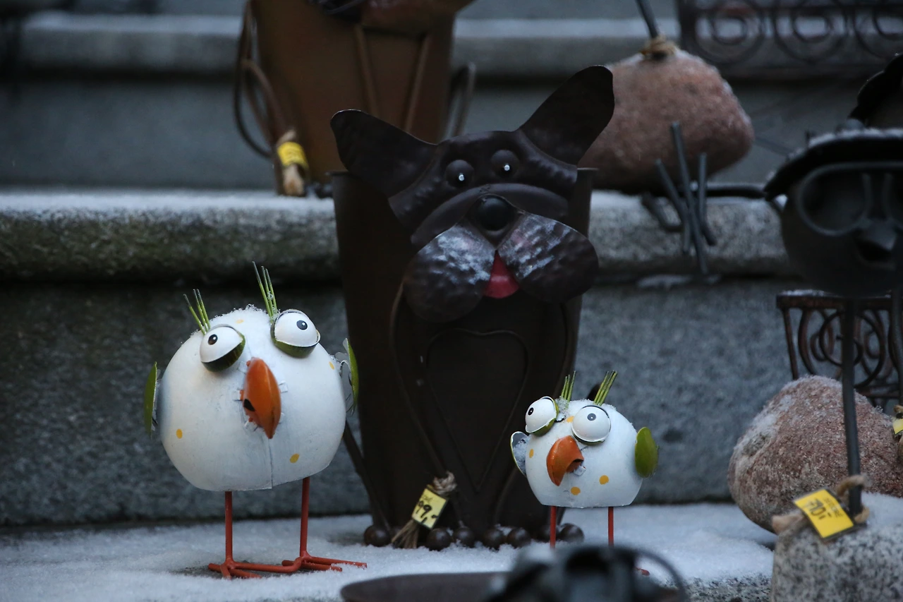 푸른 전나무 가지와 길쭉한 열매, 그리고 음표가 그려진 낡은 머그잔을 엮어 쇠 틀에 주렁주렁 무심하게 매달아 놓은 상점,