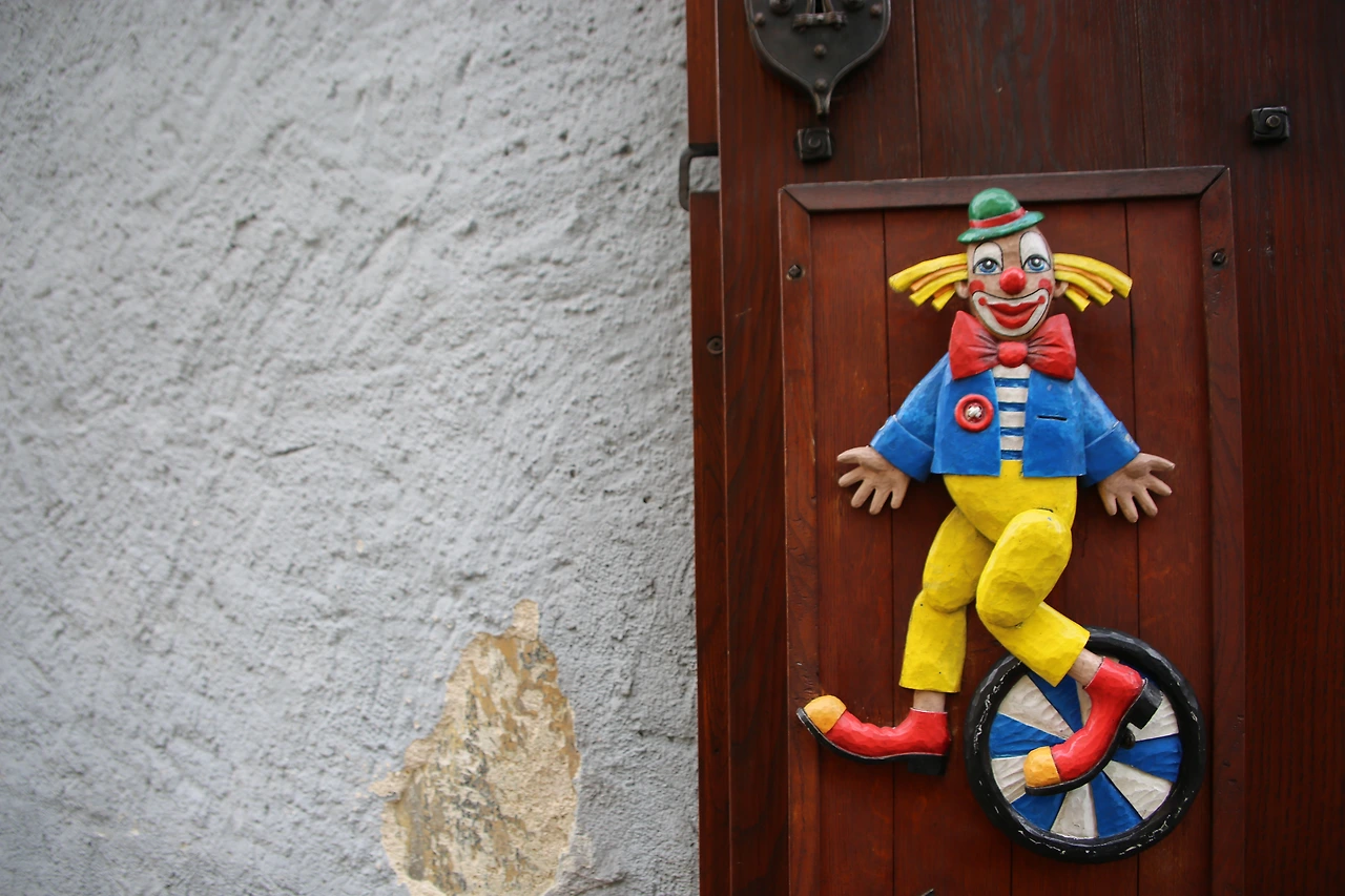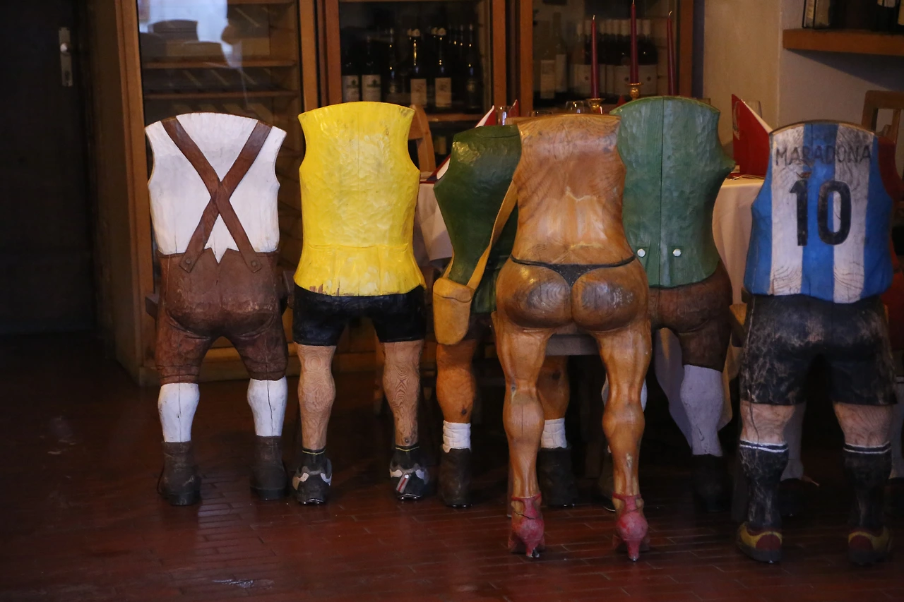 빨강과 흰색 단 두 가지 색의 물감으로 화덕 속에서 돼지 통구이를 하는 사람들과 맥주를 마시는 사람들을 그려놓은 나무 판,