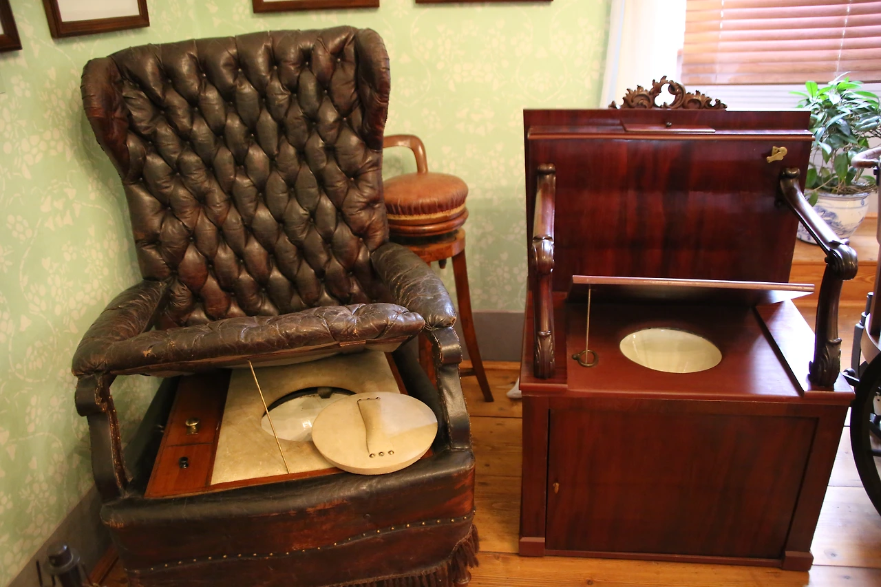 뚜껑을 덮으면 영락없는 가죽 소파지만 용변을 볼 수 있는 좌변기가 여럿 보입니다.