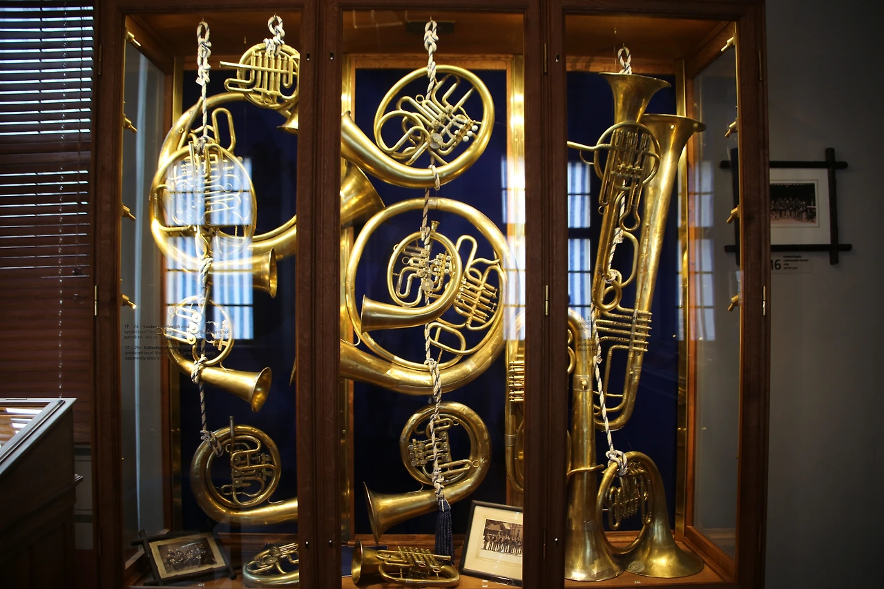 처음 보는 호른들이 유리 상자 속에 걸려 있어요.