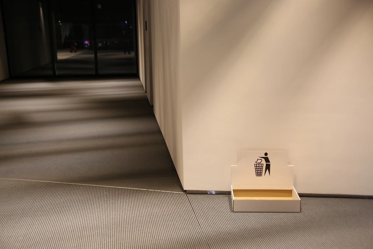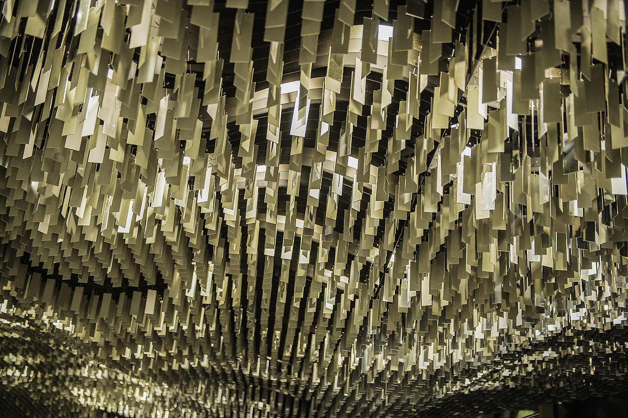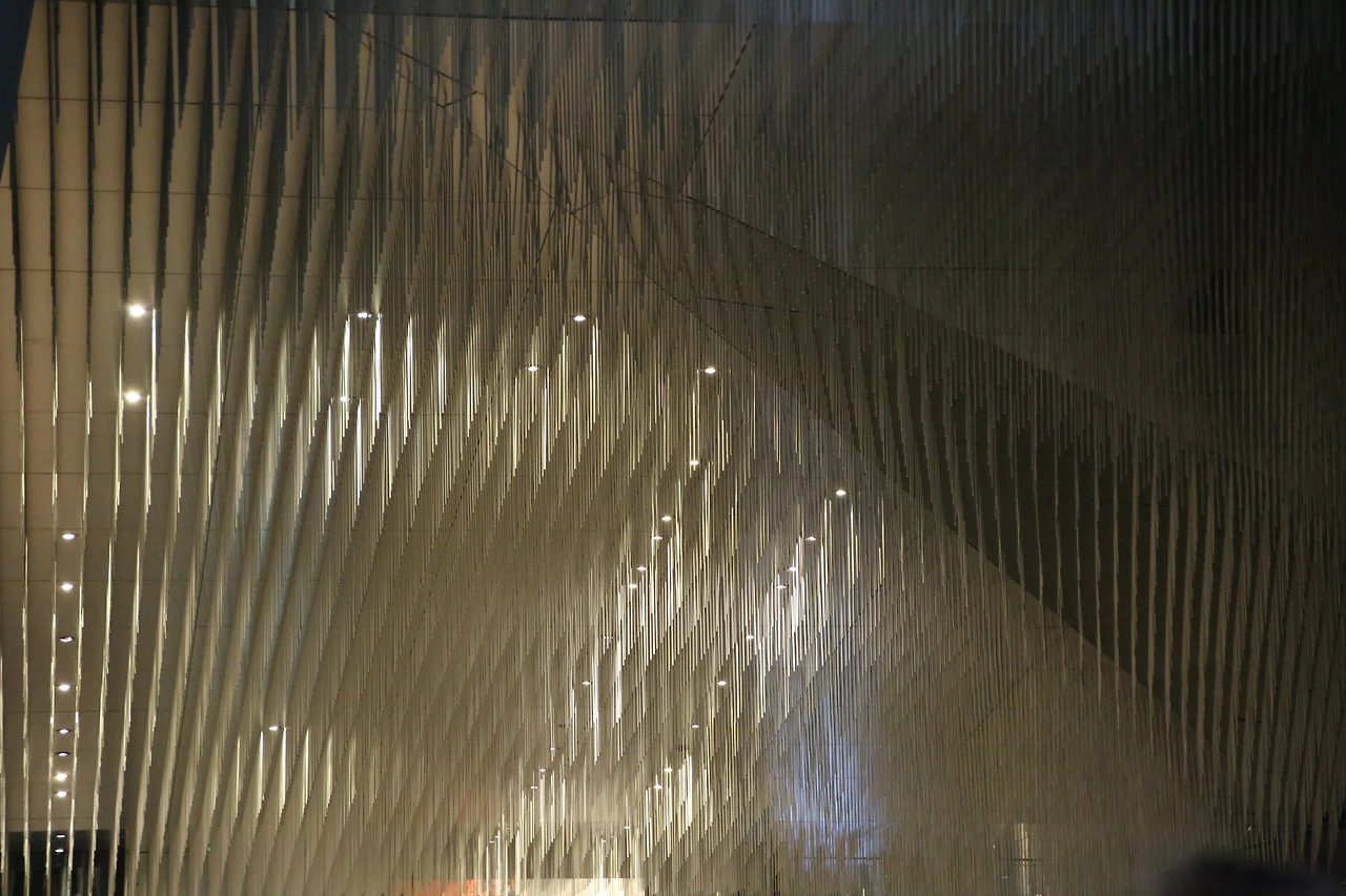 로비 천장에는 직사각형 모양의 PVC인지 금속인지 모를 얇은 조각들이 블랙 귀걸이처럼 빽빽하게 걸려 있어요.