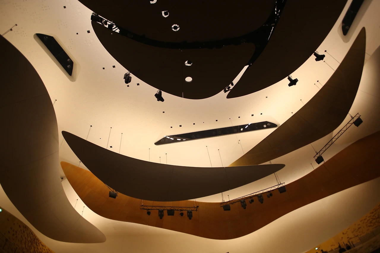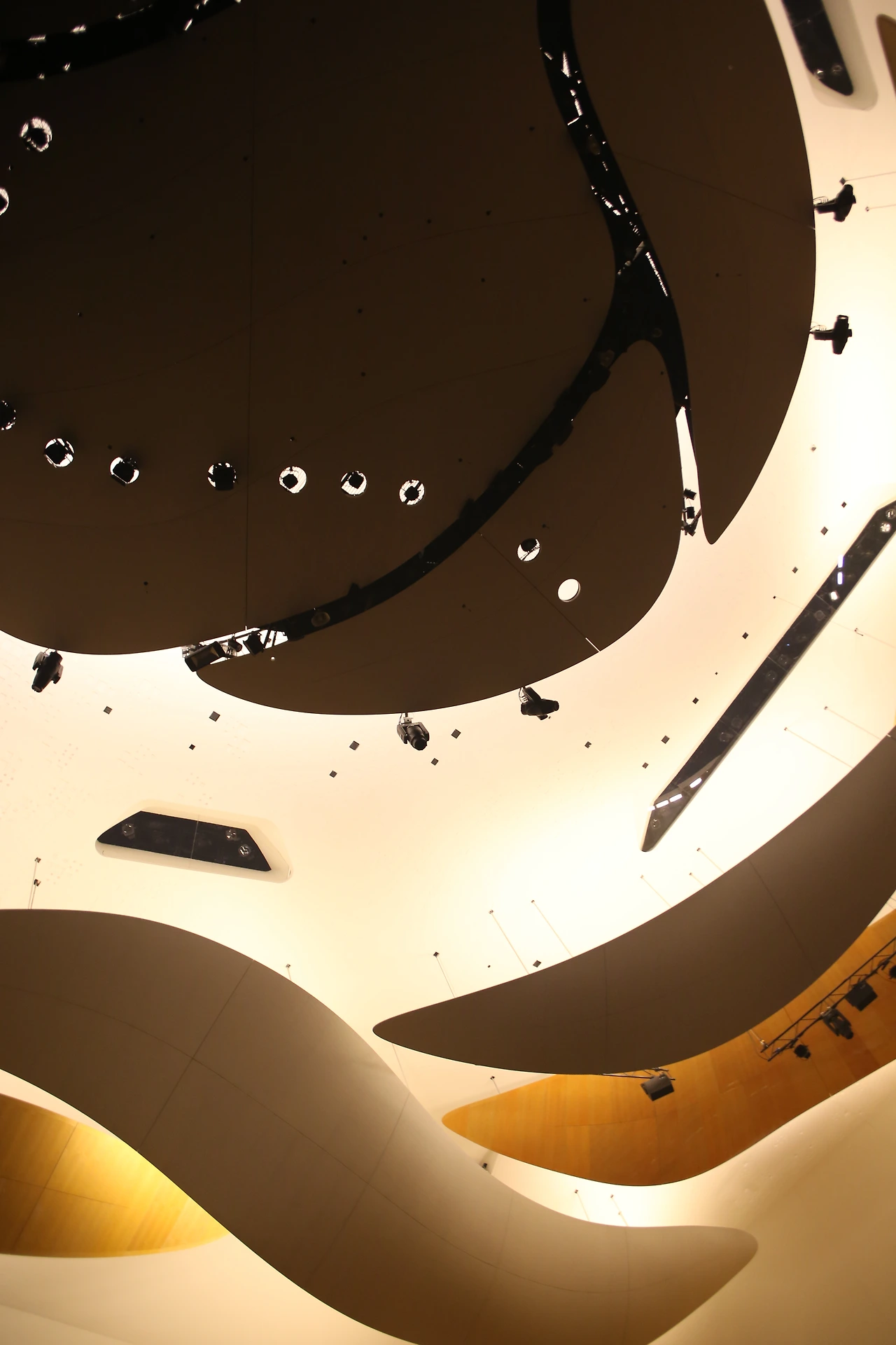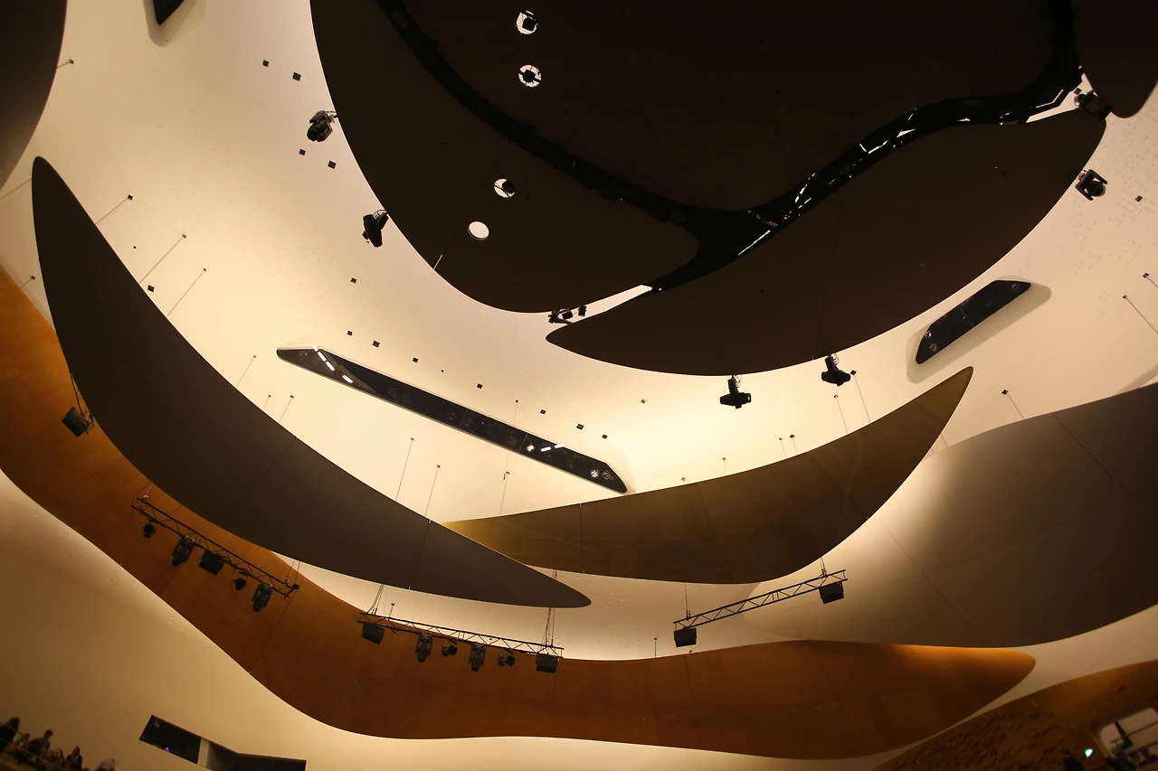 벽, 발코니, 천장에 걸린 음향 판 등 모든 면이 곡선의 날개로 춤을 추듯 걸려 있습니다.