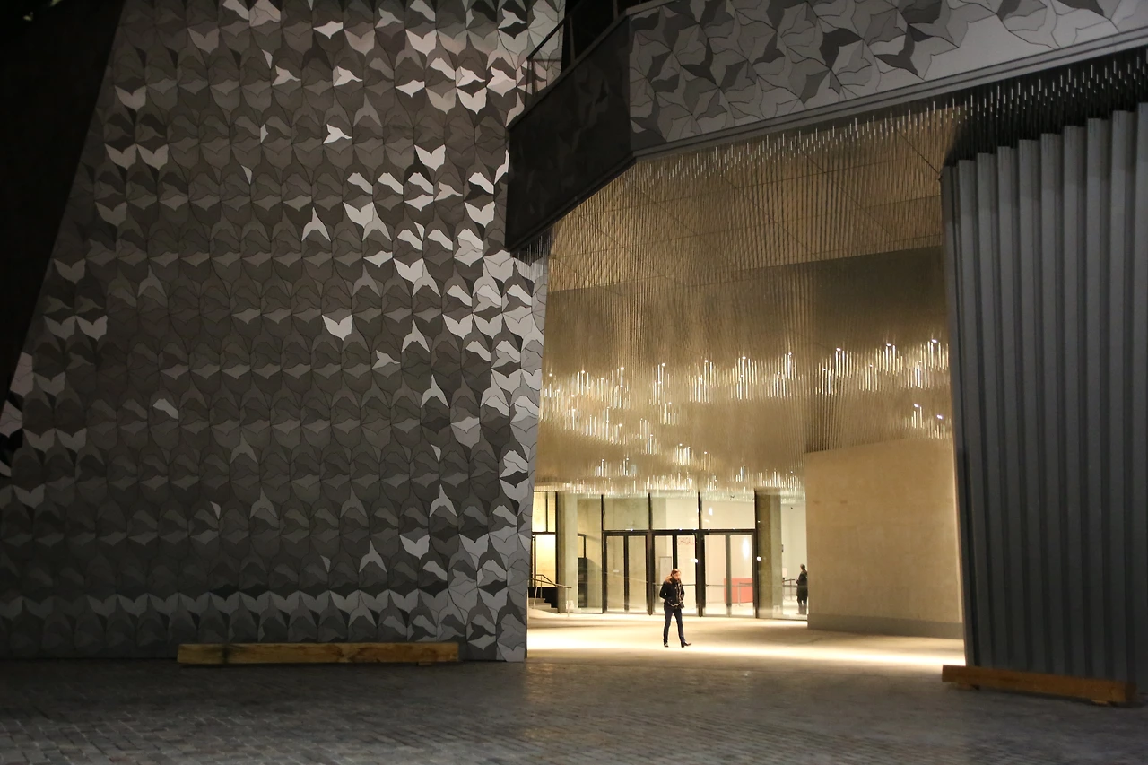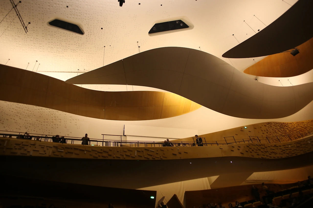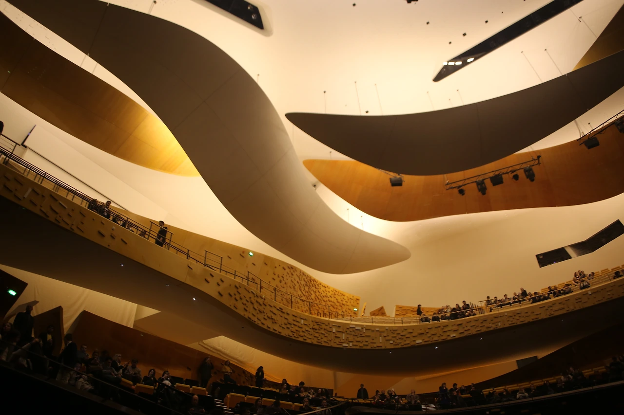 벽, 발코니, 천장에 걸린 음향 판 등 모든 면이 곡선의 날개로 춤을 추듯 걸려 있습니다.