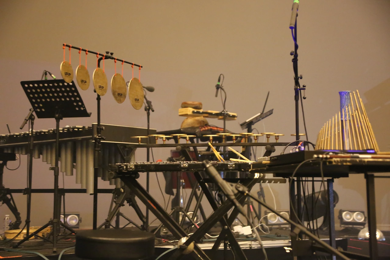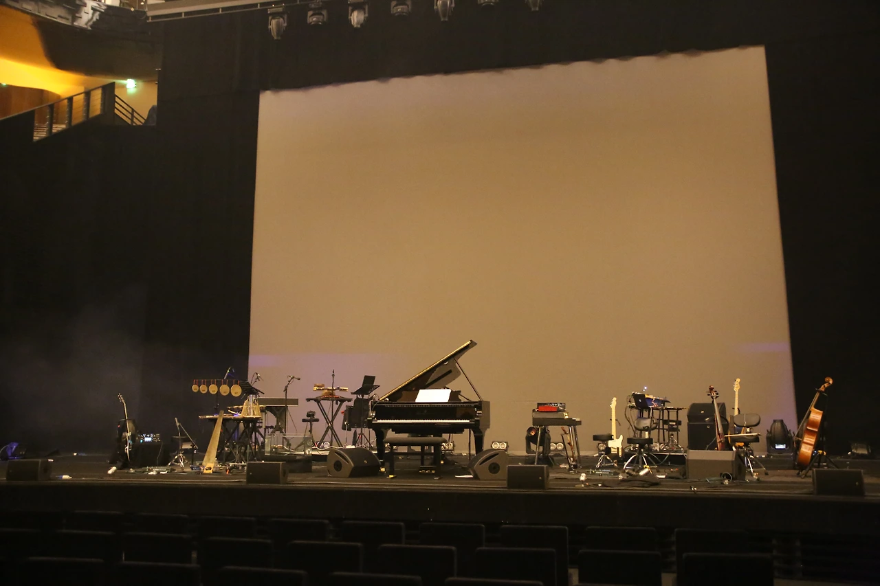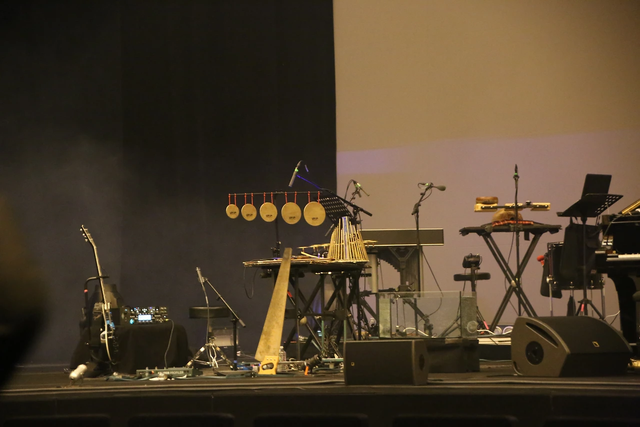 무대 위엔 피아노를 중심으로 알 수 없는 악기들이 즐비하게 놓여 있습니다.