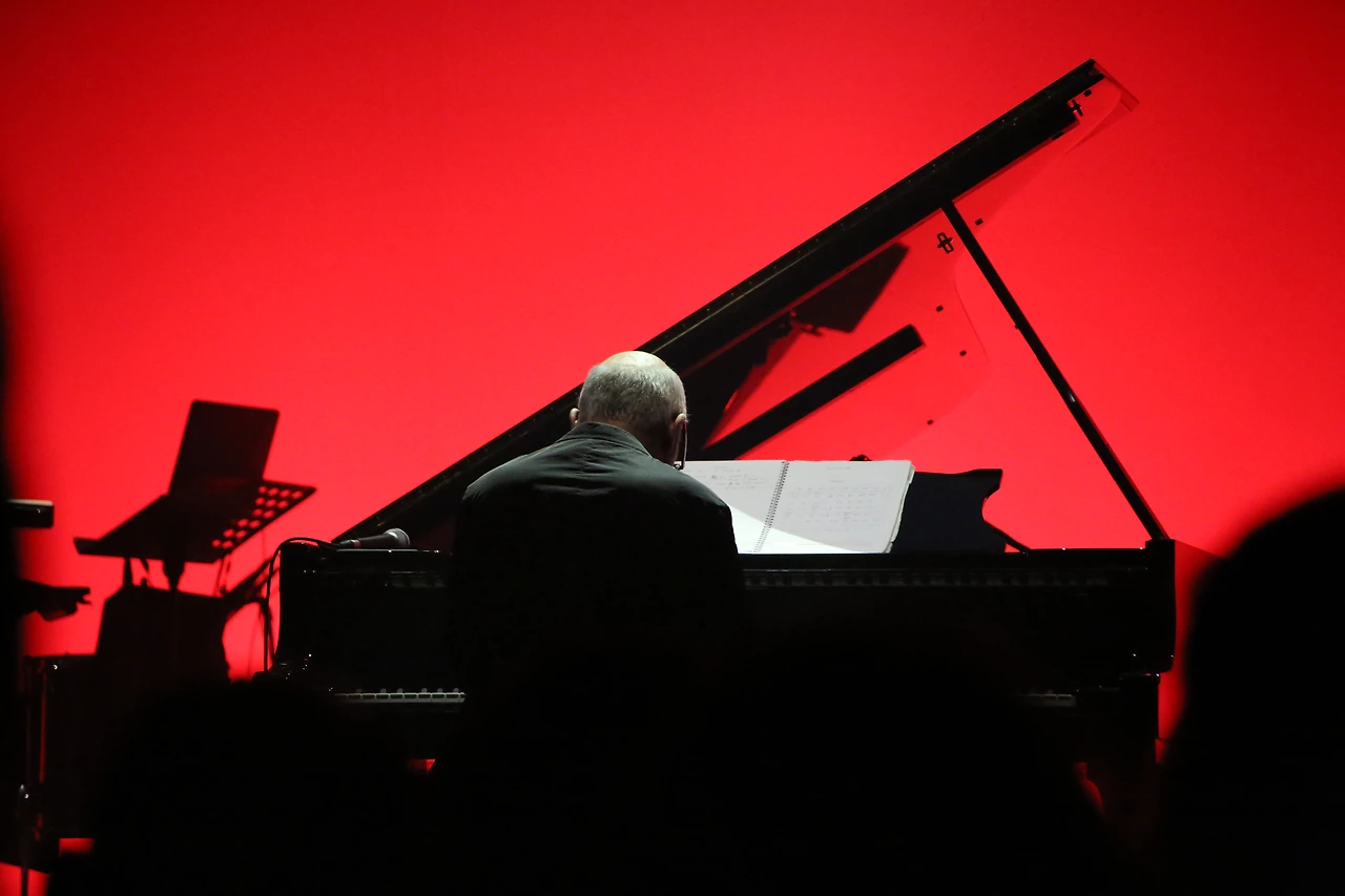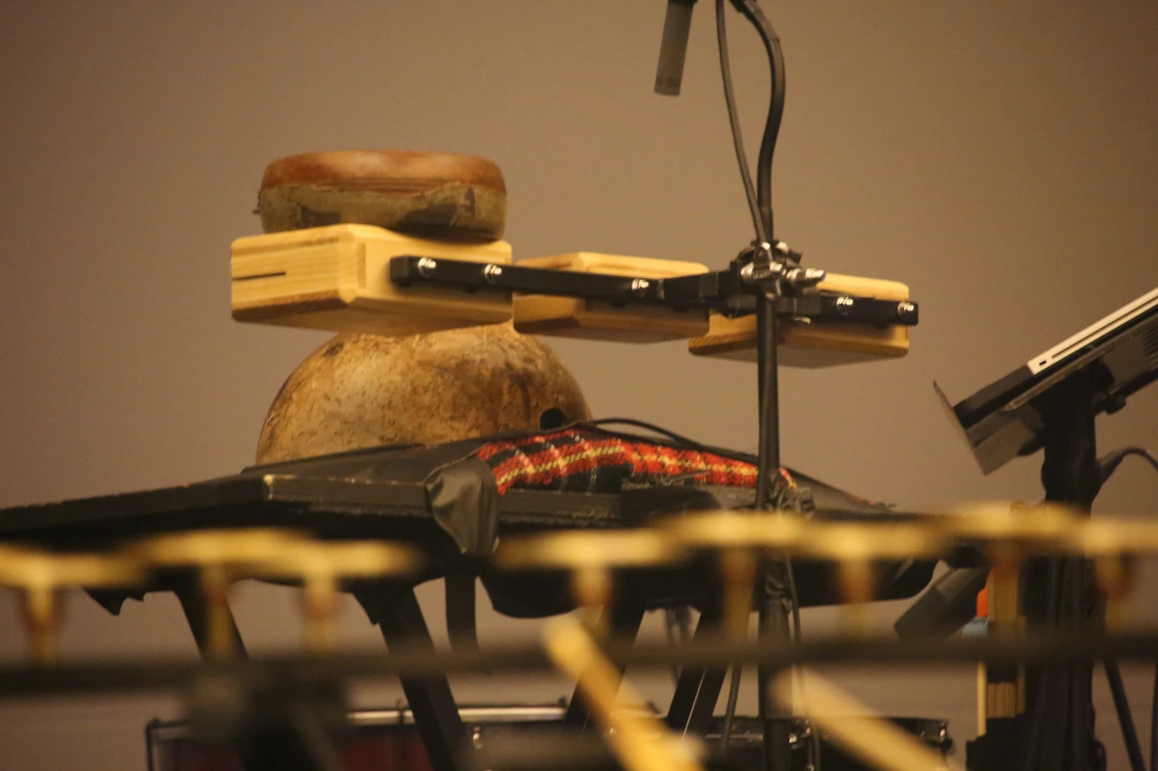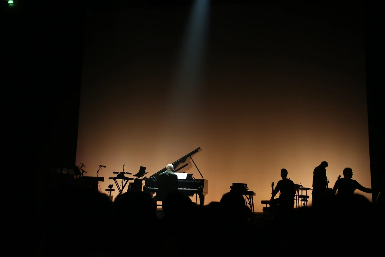 무대 위엔 피아노를 중심으로 알 수 없는 악기들이 즐비하게 놓여 있습니다.