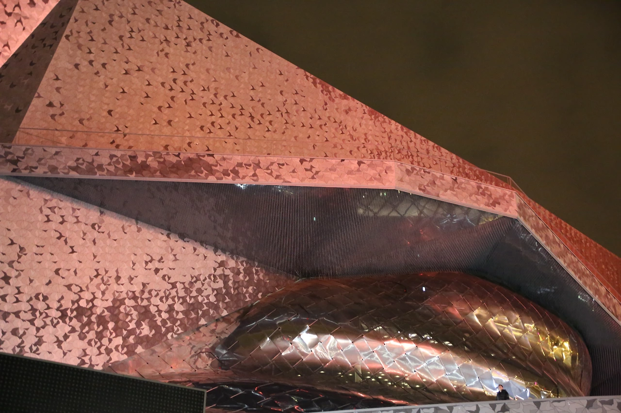 꽃잎 같기도 하고, 갈매기 날개 모양 같기도 한 메탈 조각을 건물 가득 촘촘하게 붙여 놓았어요.