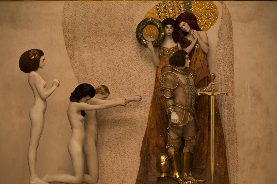 여기서 클림트는 고통받는 연약한 인간들이 행복을 가져다 줄 용감한 기사에게 간청하는 장면을 표현하고 있다.