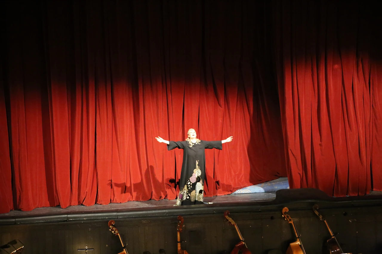 무대 가림막이 현대적인 의상을 입은 여인이 앉아있는 프린트예요.