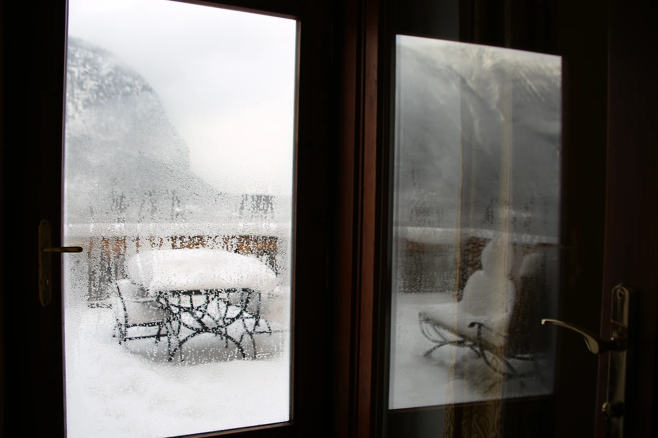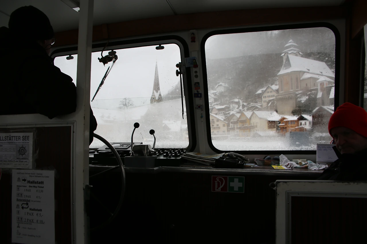 작은 배의 유리창에 뿌연 수증기가 어려서 할슈타트의 아름다운 모습이 잘 보이지 않았다.