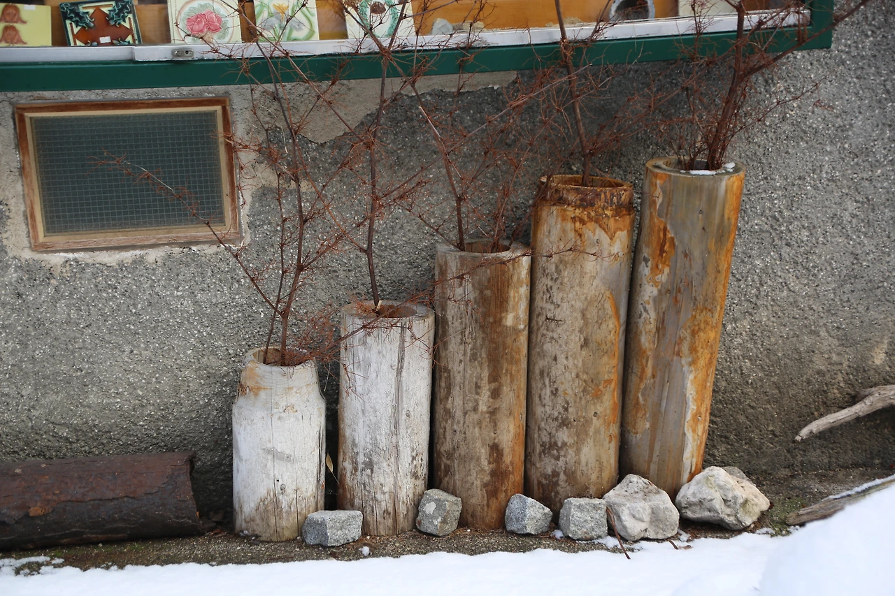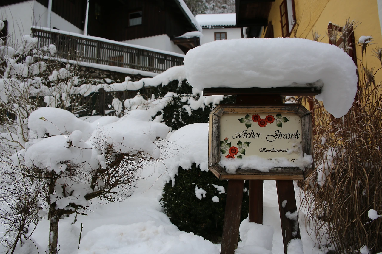 작은 아틀리에 나무 간판 위에 눈이 수북하게 쌓여있다.