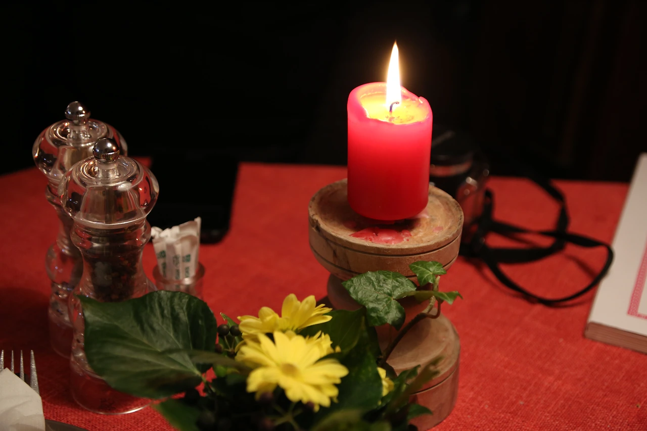 빨간 테이블보 위에 하얀 레이스가 둘러진 전등갓, 그위엔 빨간 장미 하나.