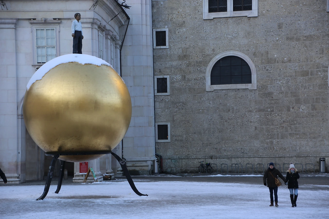 원형의 금색 공 모양 위에 한 남자가 서 있는 모양인데 작가 이름이나 작품명은 보이지 않았어요.