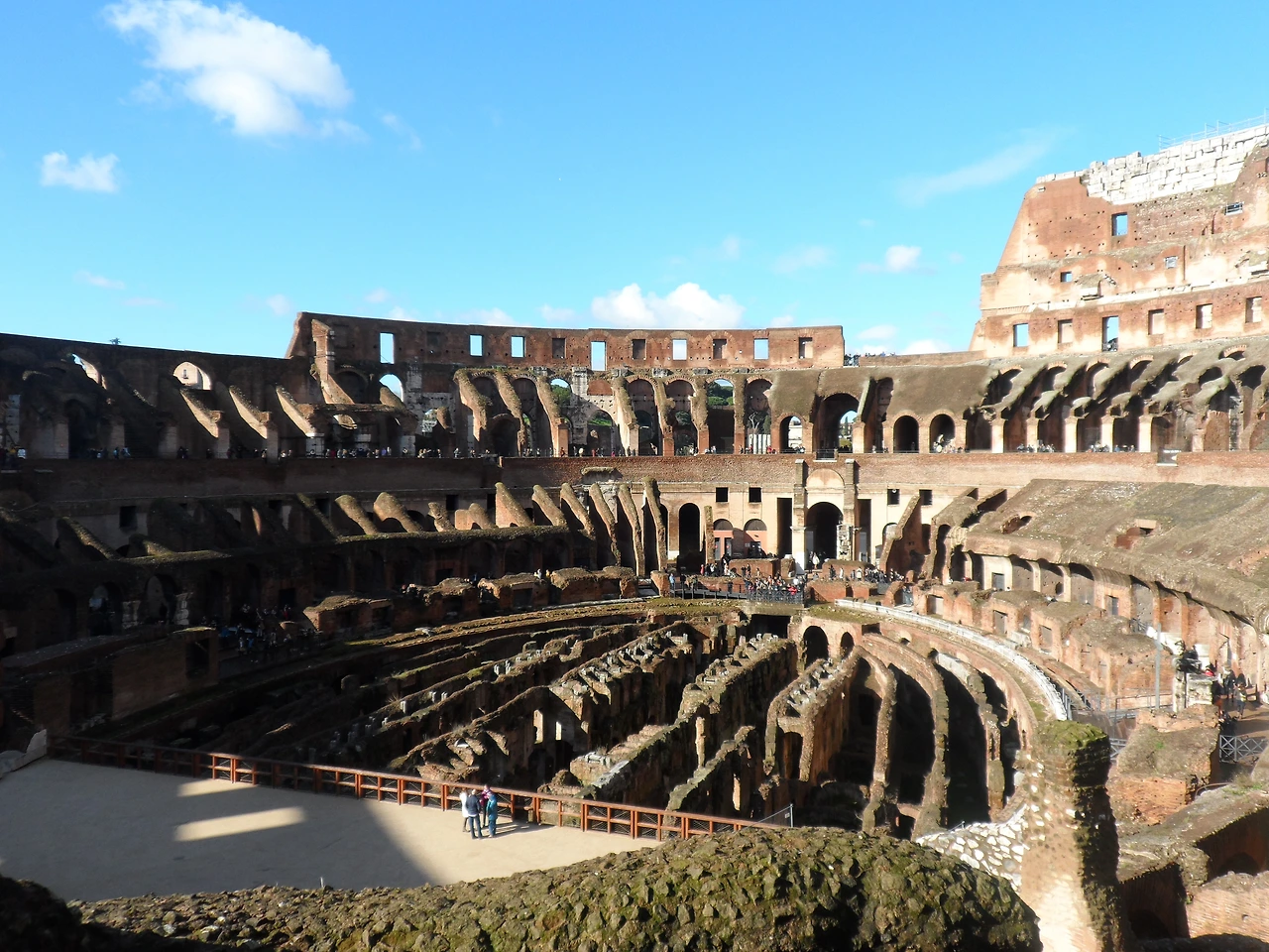 콜로세움 주변엔 검투사 복장을 한 근육질 남자들이 여기저기서 얼쩡댄다. 무턱대고 그와 함께 사진을 찍다간 덤터기 쓸 수 있으니 조심해야 한다. 콜로세움은 인간들의 쾌락을 위해 피비린내 나게 하던 아픔의 장소다. 콜로세움 아래쪽에 검투사와 맹수들이 대기했던 장소가 적나라하게 보인다. 잔인함과 공포심이 즐겼던 당시 광경을 생각하면 섬뜩하다. 콜로세움은 80여 개의 아치형 문을 통해 5만 명이 넘는 인원이 10분 안에 입장할 수 있다고 한다. 무더운 여름에는 돔 형태의 천장 지붕이 태양을 막아주는 설계이다. 검투사 러셀 크로우가 열연한 영화 <글레디에이터>가 뇌리를 스친다.