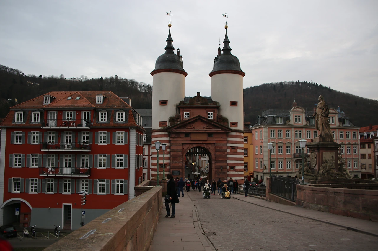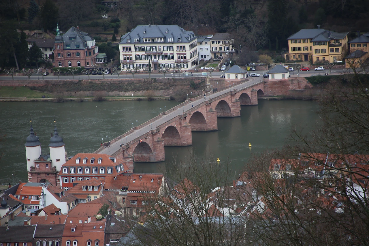 하이델베르크를 관통하는 네카 강 위로 오래된 카를 테오도르 다리가 보인다.
