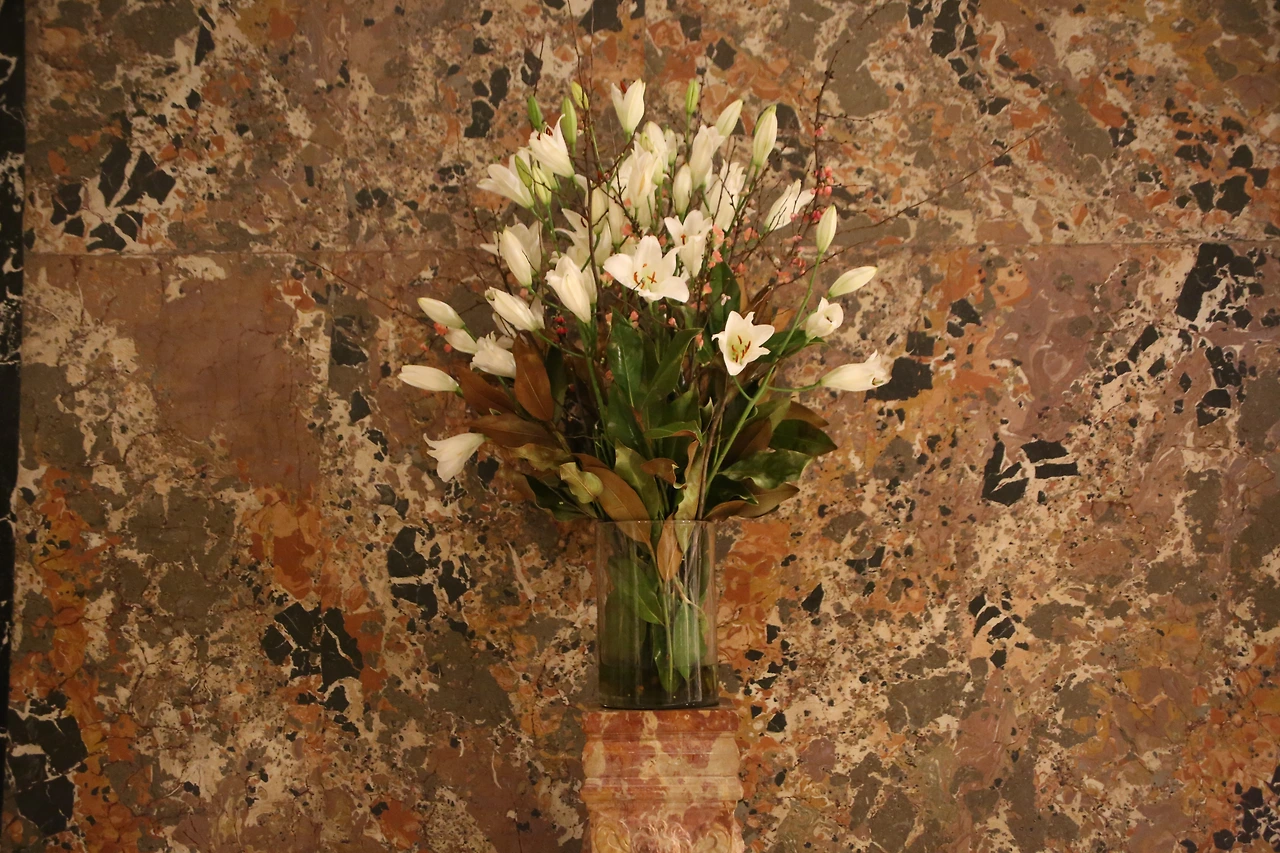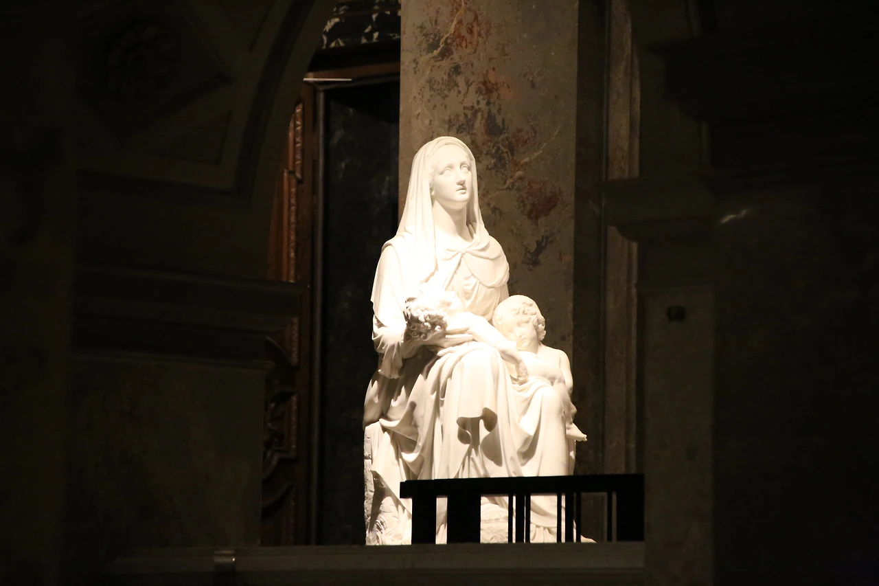양쪽으로 갈라지는 계단의 중앙에는 시선을 사로잡는 하얀 대리석 조각이 있는데요.