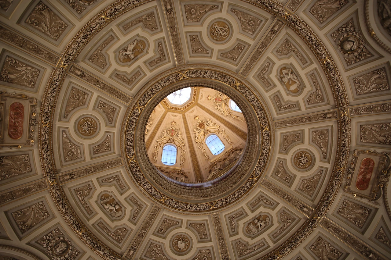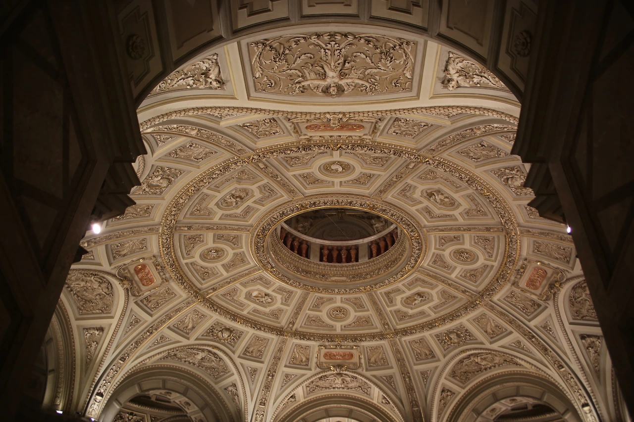 중앙 돔 아래로 세 개의 아치가 2층 회랑 중심에 있습니다.