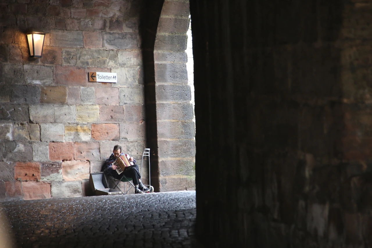 오가는 이가 거의 없는 돌 문 안에서 아코디언을 연주하는 남자의 표정이 우울해 보였다.