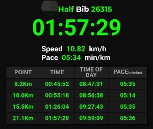 처음부터 끝까지! 1시간 57분 29초. 페이스 5분 34초.