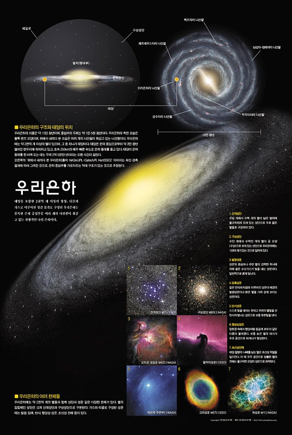섀플리(1917년)라는 과학자가 세상에 등장하기 전까지 우리 은하의 중심은 '태양'으로 알고 있었습니다. 그러나 섀플리가 관측 결과를 토대로 우리 은하의 중심이 태양이 아니라는 것을 알아냅니다. 그 후, 허블(1923년)이 안드로메다 성운이 우리 은하 밖의 외부 은하임을 밝혀 냄으로서 우리의 시야를 더욱 확장시킬 수 있었습니다. 그리고 2005년에는 우리 은하의 구조가 정상 나선 은하가 아닌 막대 나선 은하라는 것을 확인할 수 있었습니다. 우리가 관측한 우리 은하의 크기는 얼마나 클까요?