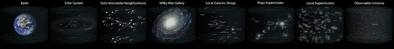 우리가 외계인에게 우리가 어디 있는지 알려주기 위해선 우리가 어디에 속해 있는지를 알아야 합니다. 그렇기에 오늘은 지구부터 우주 거대 구조까지 긴 여정을 같이 떠나 보도록 하겠습니다.