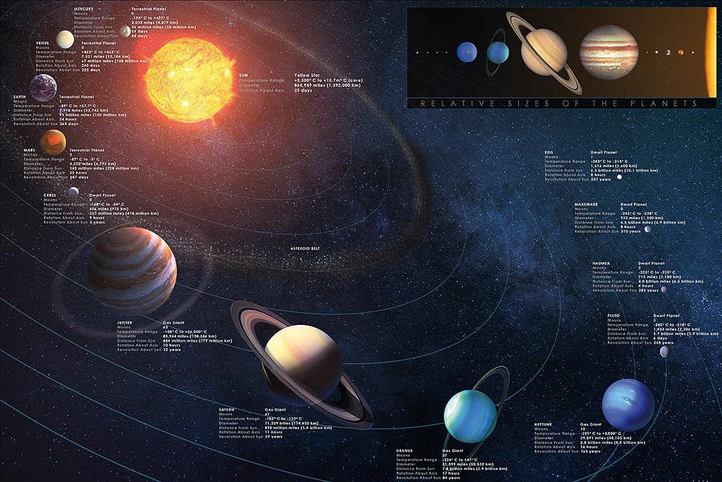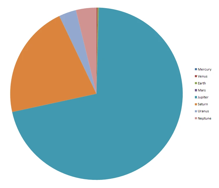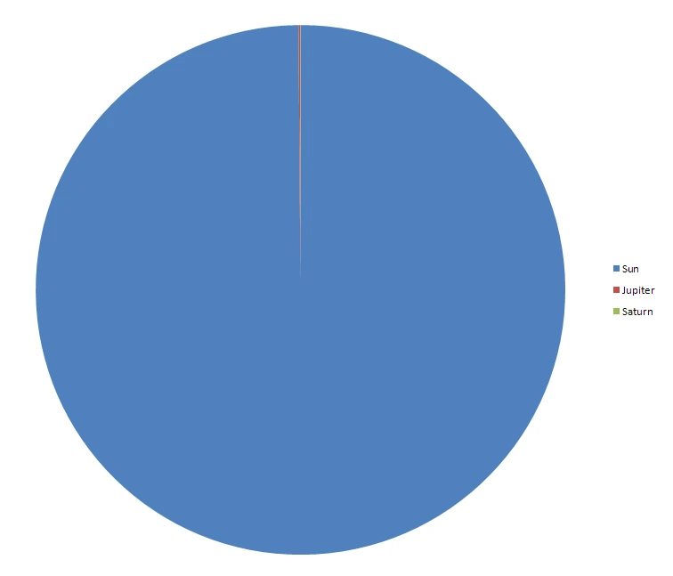 그래프에서 보다시피 태양의 질량이 압도적으로 큽니다(약 99.86%,1.9891 ×10^30Kg). 그리고 목성과 토성이 큰 비중을 차지하는데, 그 말은 지구형 행성(수성, 금성, 지구, 화성)보다 목성형행성(목성, 토성, 천왕성, 해왕성)이 더 질량을 많이 차지한다는 것을 알 수 있습니다.