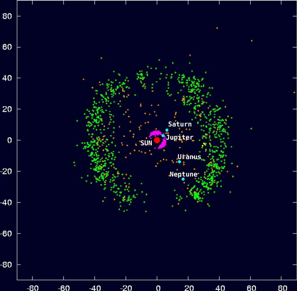 카이퍼 벨트는 소행성대와 성질이 비슷한데 주요 물질이 얼음입니다. 여기 있는 천체들은 왜 행성으로 분류될 가능성이 있습니다. 그래서 명왕성이 퇴출당하는 사건이 발생하기도 하였습니다.