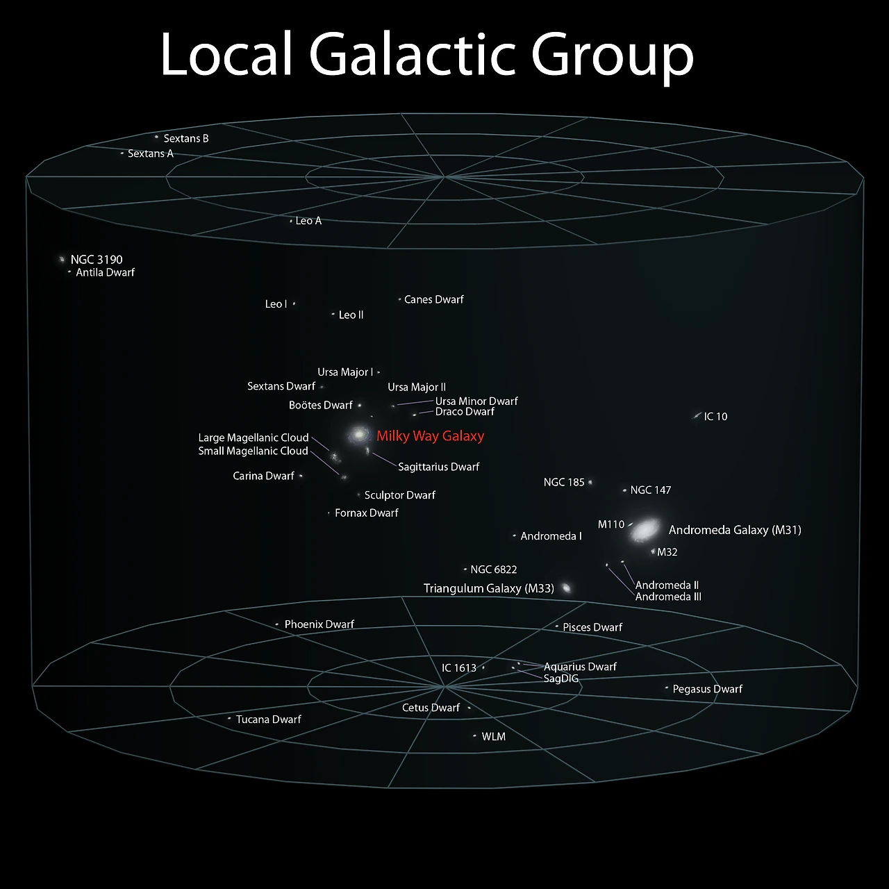 거리가 가까운 은하들은 묶어놓은 단위를 '은하군'이라고 합니다. 우리가 현재 포함되어 있는 국부 은하군을 보면 주요하게 안드로메다 은하, 우리 은하, 삼각형 자리 은하가 존재합니다. 그 이외에 대부분의 은하들은 대부분 규모가 작은 왜소 은하 이거나 불규칙 은하, 또는 안드로메다와 우리 은하에 묶여있는 위성은하입니다. 크기는 상대적으로 안드로 메다 은하가 우리 은하보다 크지만 우리 은하가 상대적으로 암흑물질을 많이 가지고 있기 때문에 질량은 우리 은하가 더욱 무겁습니다. 국부 은하군에는 54개의 은하가 있다고 알려져 있습니다. 하지만 그 숫자는 유동적이어서 54개라는 것도 지구에서 관측되는 것만을 말한 숫자입니다. 그렇기에 아직까지 관측되지 않은 은하까지 포함한다면 54개보다 더 많은 은하가 국부은하군을 구성하고 있을 것이라고 예측됩니다.